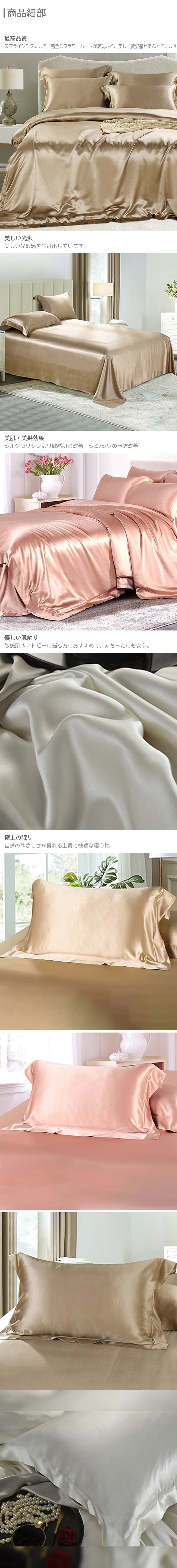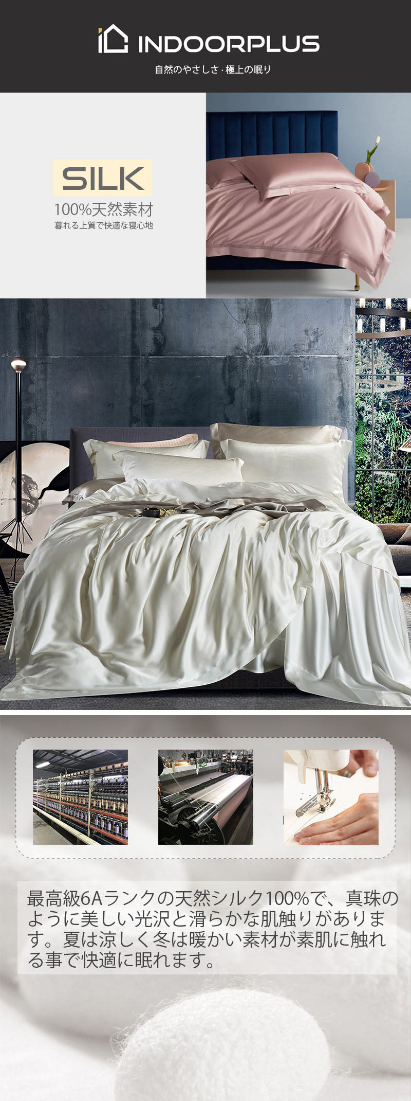 シルクは滑らかな肌触りを実現できる為、他の素材より滑り落ちやすいのが事実ですが、弊社のシルク製品の縁がずれ防止のデザインで丁寧に縫製され、ベッドから滑り落ちません。カバー内側にずれ防止の紐がついている為、布団が泳いでいる心配する必要がございません。