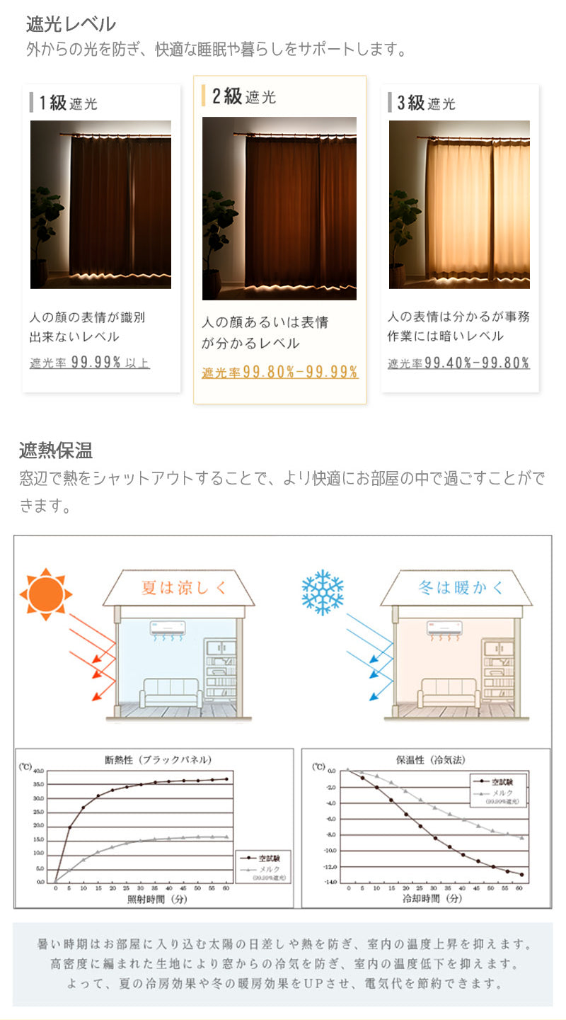 ・機能:遮光、遮熱、防音、防虫・防ダスト効果。 形態安定加工、洗濯機又は手で丸洗い可能 ・遮光レベル:遮光2級 |