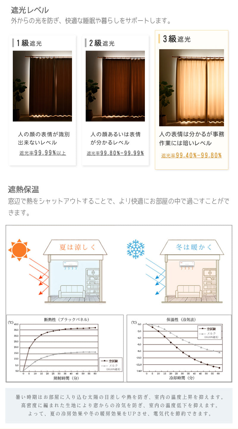 ・機能:遮光、遮熱、防音、防虫・防ダスト効果。 形態安定加工、洗濯機又は手で丸洗い可能 ・遮光レベル:遮光3級 |