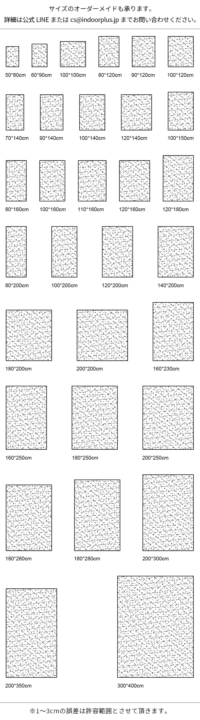 カーペットは織物構造の製品の為、若干サイズのずれが発生しますが、使用に影響が出ない程度に収まります。特に手織りのカーペットにつき、模様を美しくする為に、職人さんより微調整することもありますので、予めご了承ください。