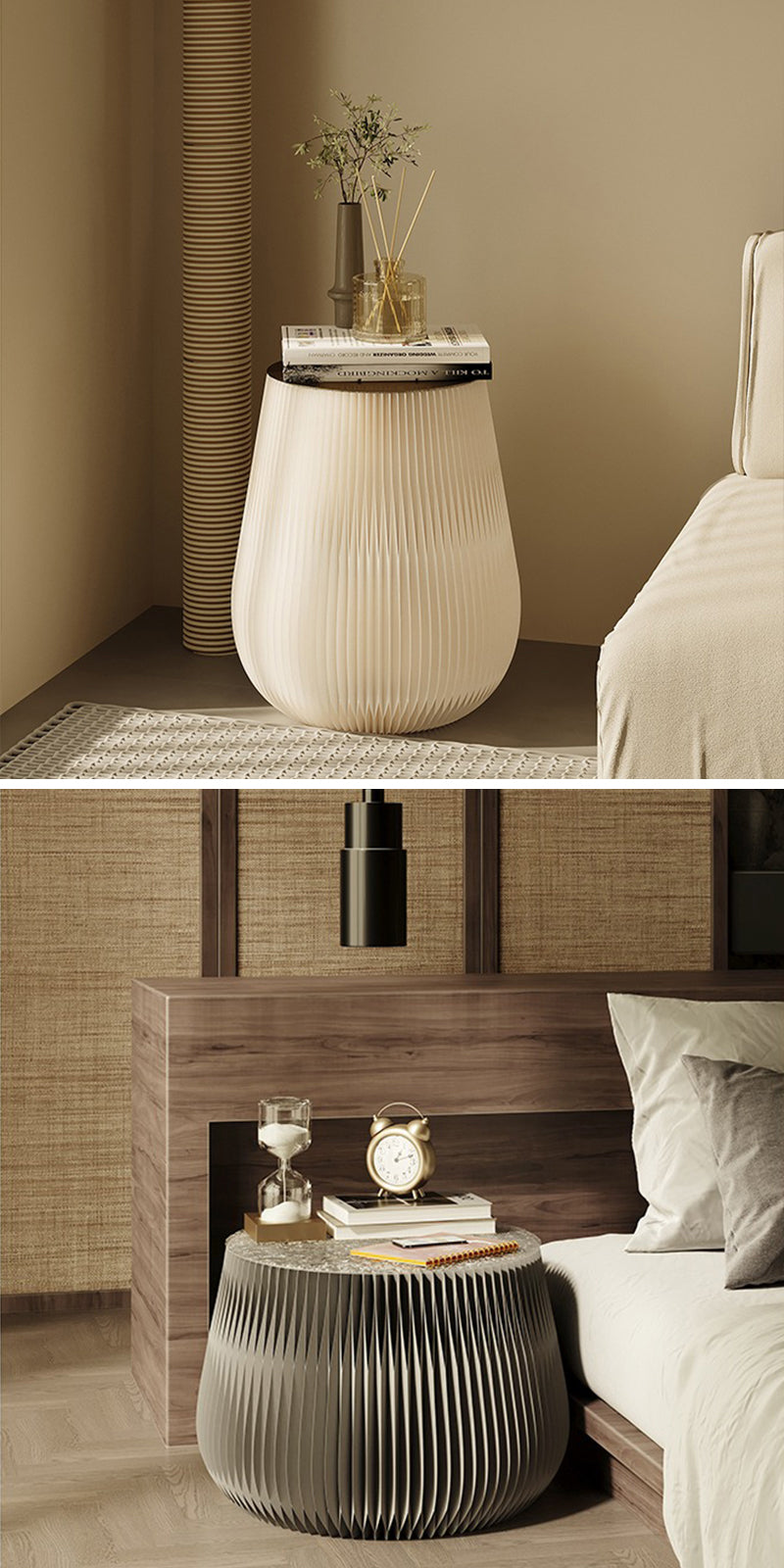 蜂の巣構造を応用したクラフト紙の本体は、軽やかさと安定感を兼ね備え、