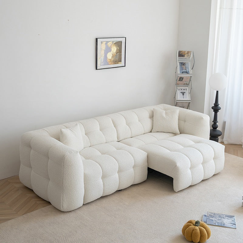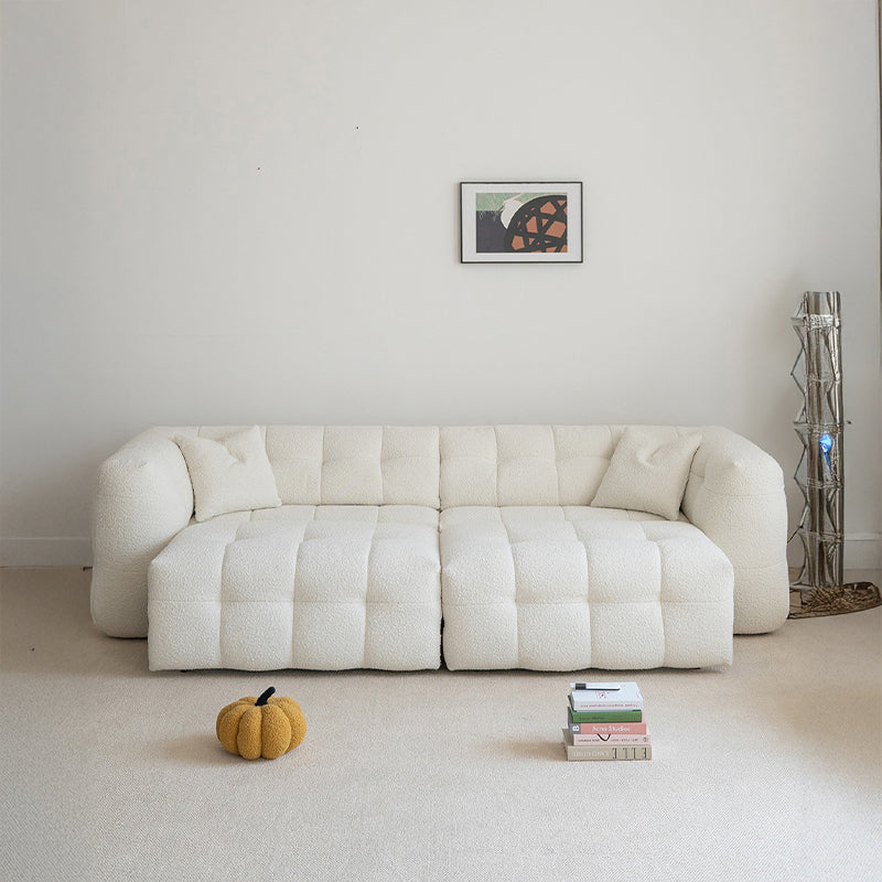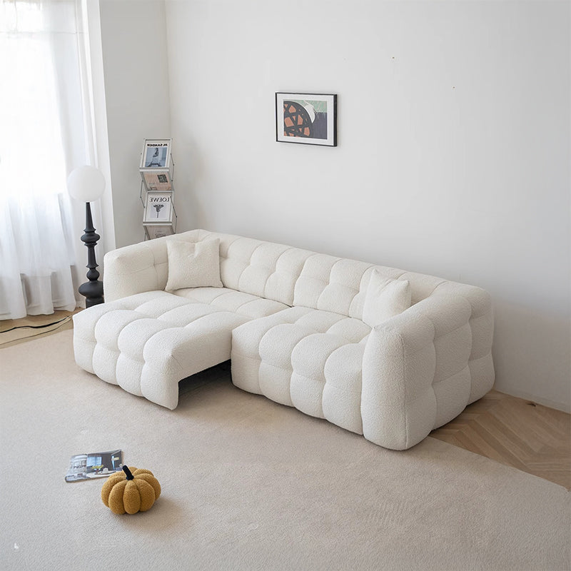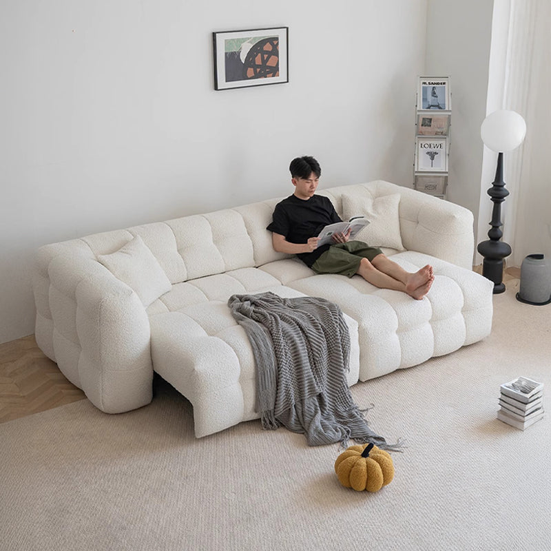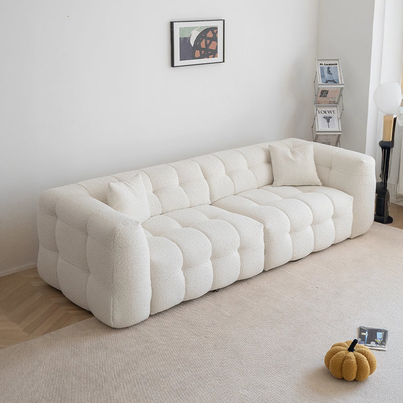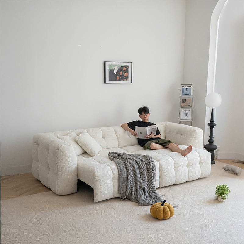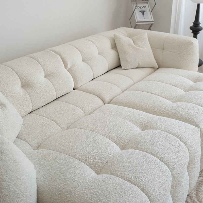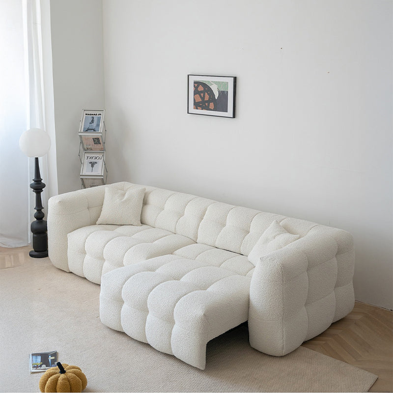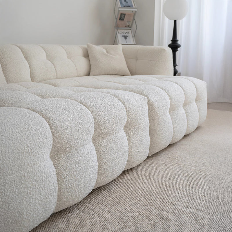 ふんわりとしたブークレ調と、ボリューム感のあるスクエアフォルムが印象的なカウチソファ。