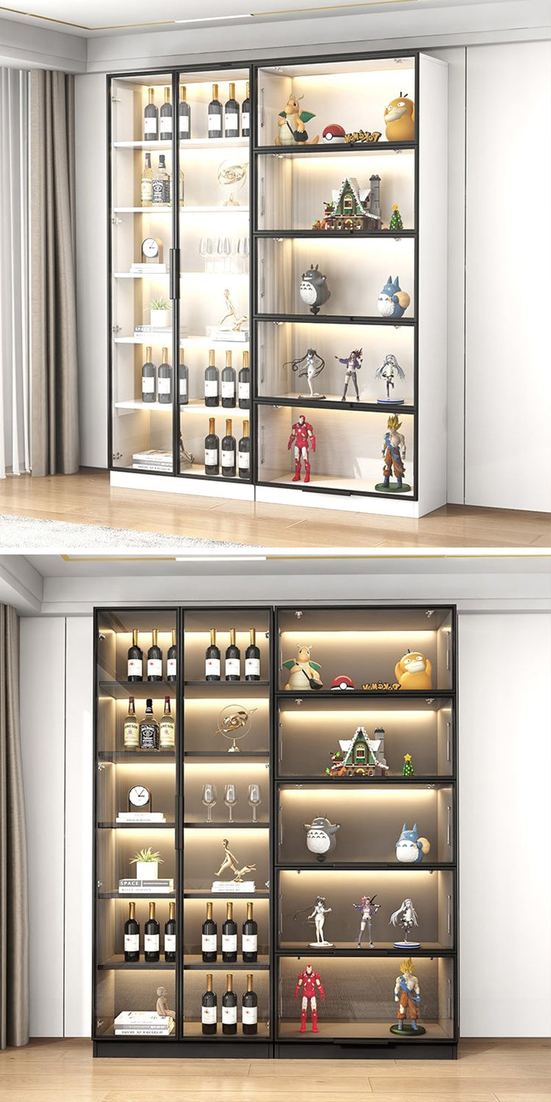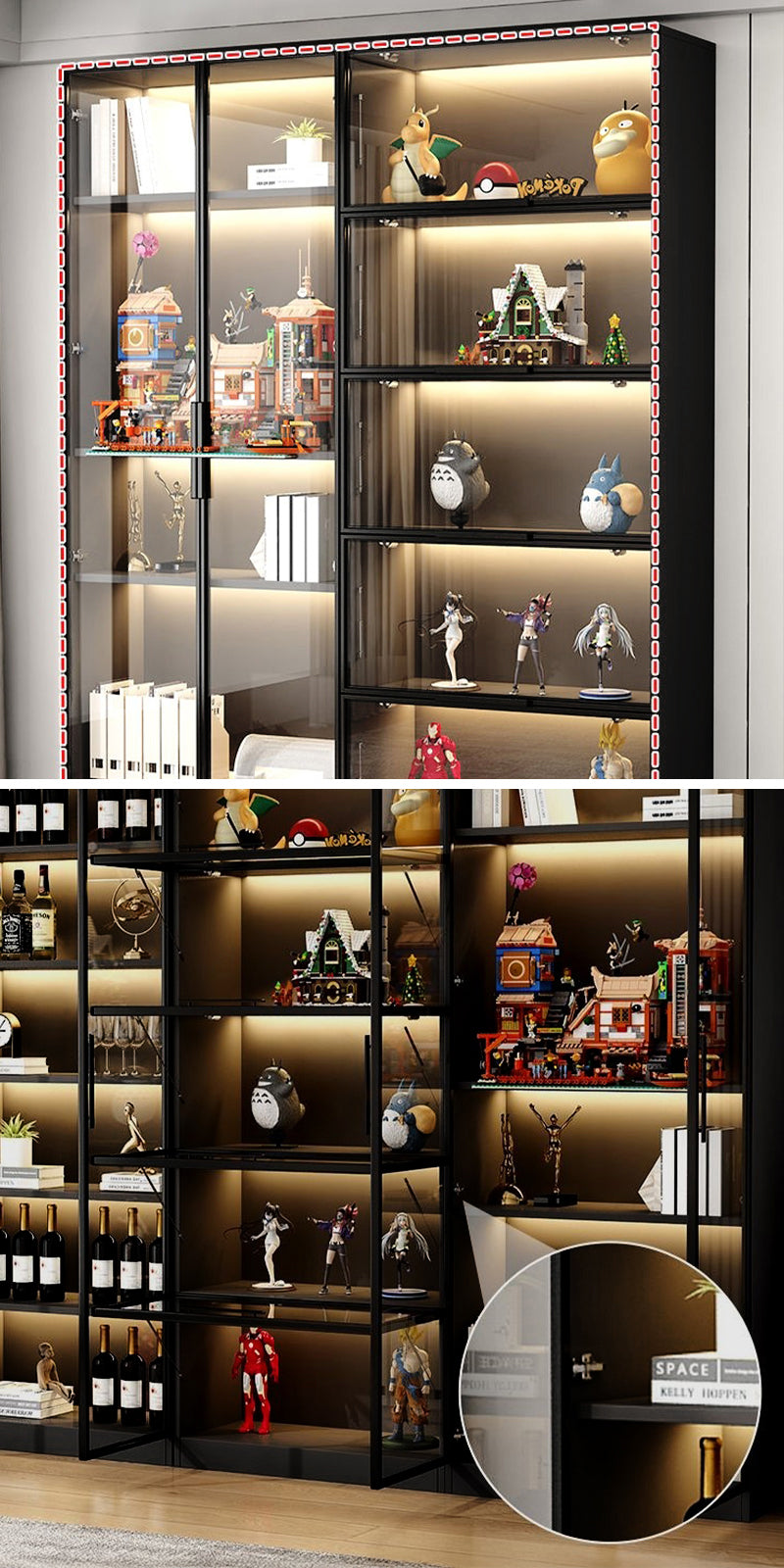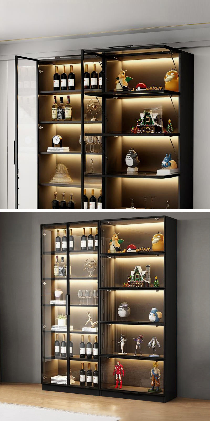 キャビネット内に内蔵されたLEDライティングが、収納アイテムを優しく照らし、目を引く美しいディスプレイを作り出します。