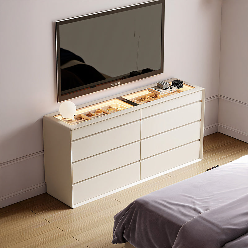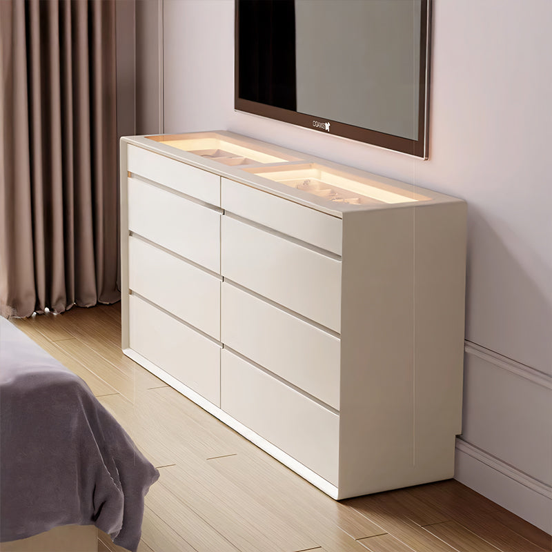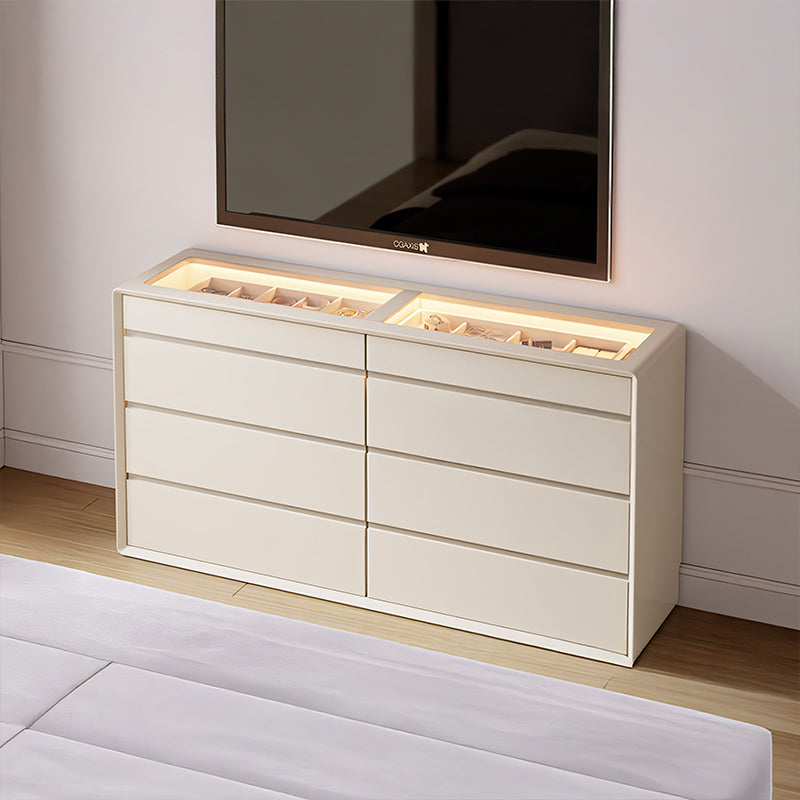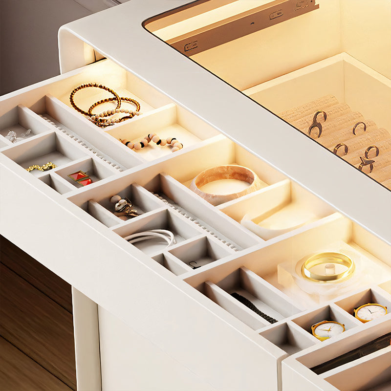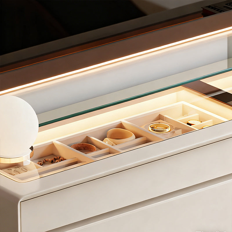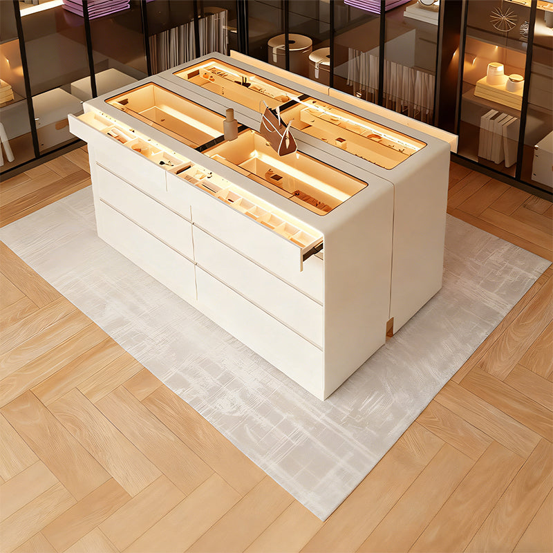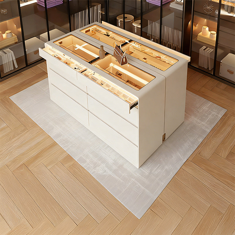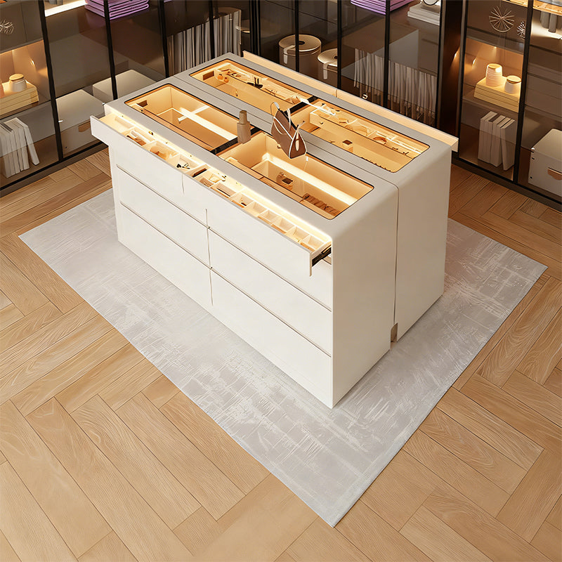 キャビネット内部にはLEDライトが組み込まれており、照明効果により展示品をより一層輝かせます。ライトの柔らかな光が、ジュエリーの一つ一つにスポットを当て、空間にラグジュアリーな雰囲気を醸し出します。