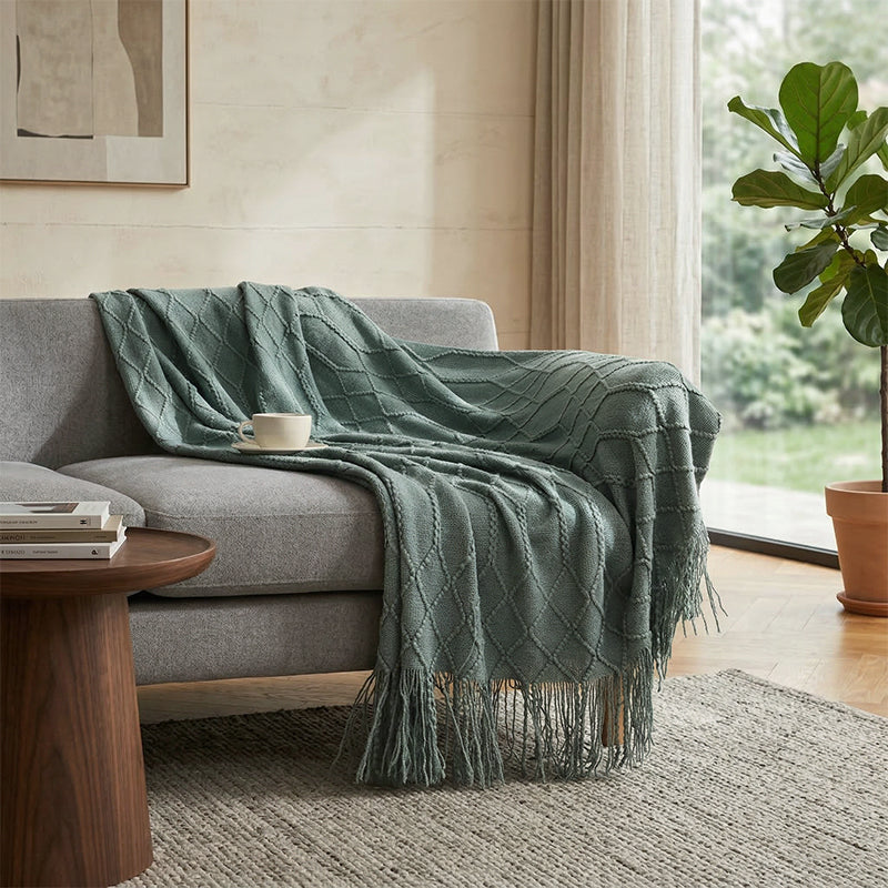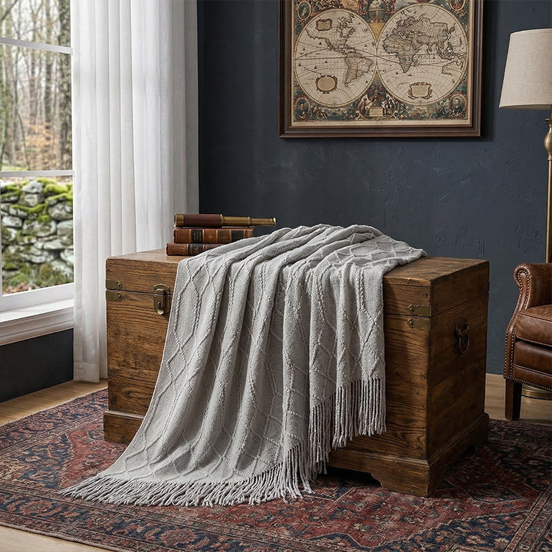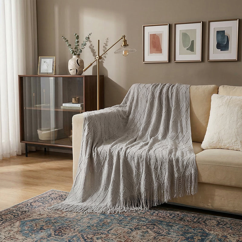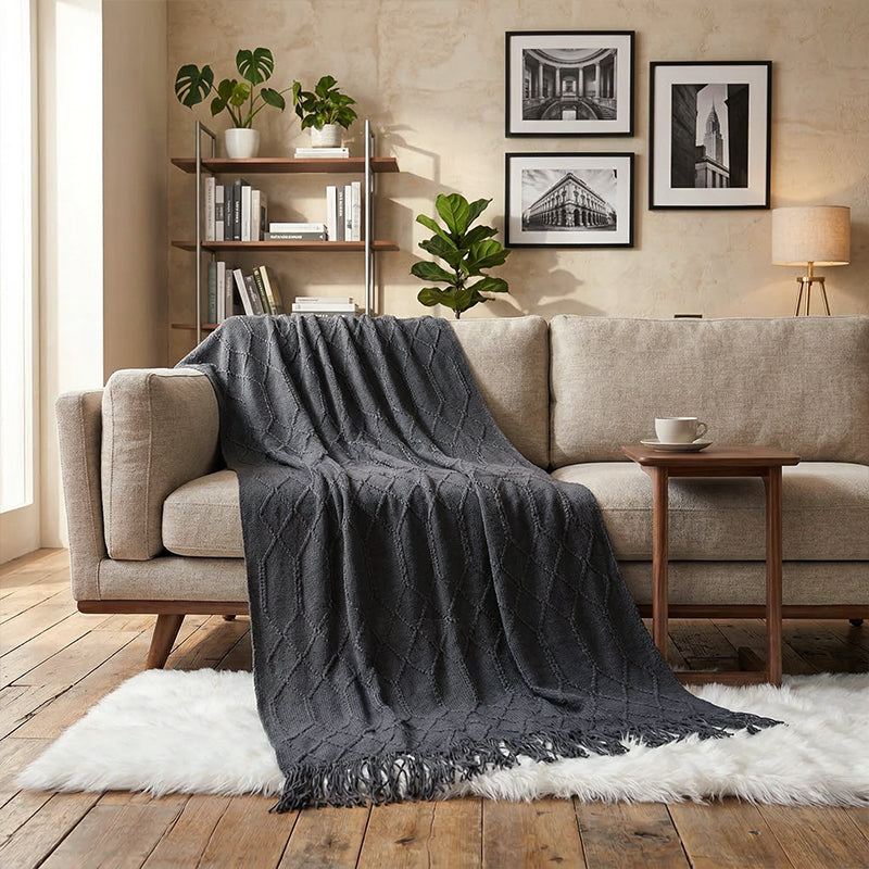 シンプルな立体模様と、上品で洗練されたカラートーンが魅力です。モダンな空間はもちろん、ミッドセンチュリーやミニマルなスタイルとも相性良く、リビングや寝室、読書スペースなどで雰囲気を高めるアクセントとして活躍します。