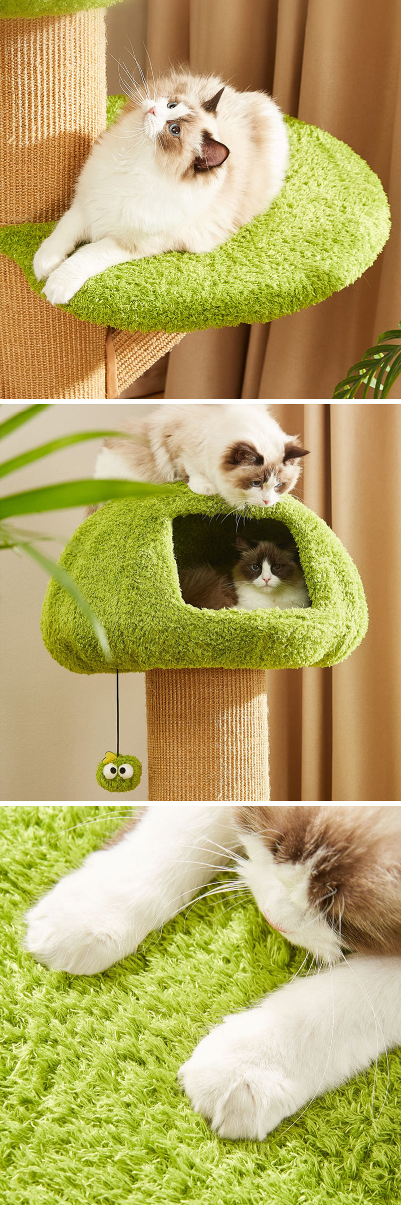 隠れ家スペース、登り棒、そしてぶら下がり玩具が一体になっており、猫の遊び心を刺激します。