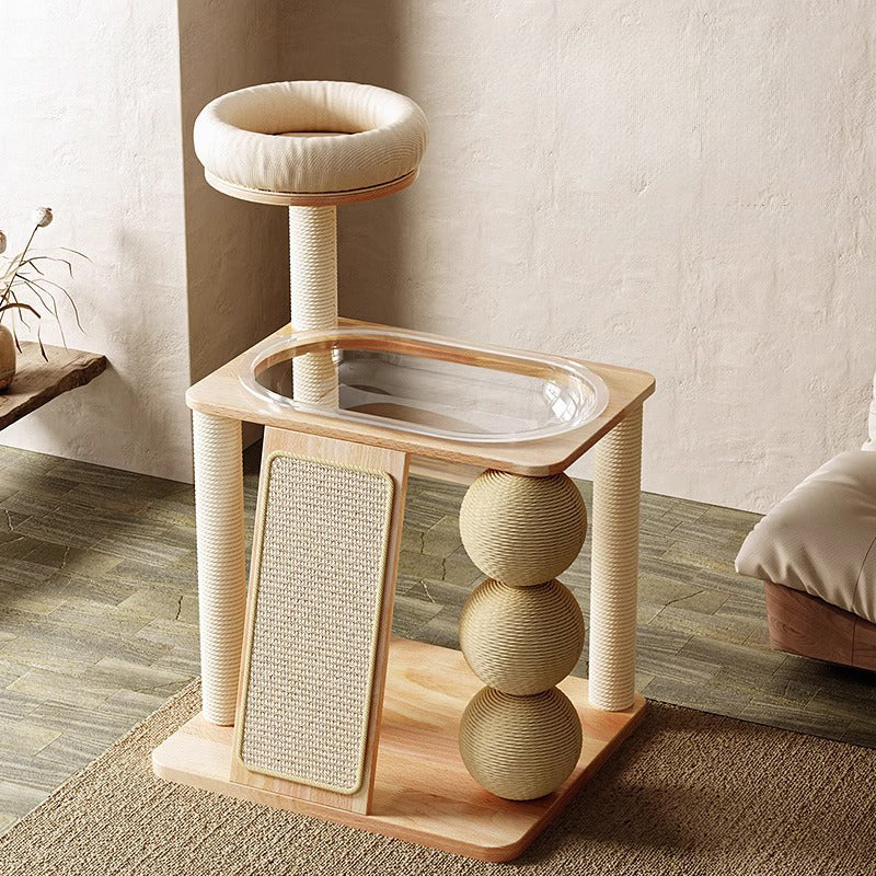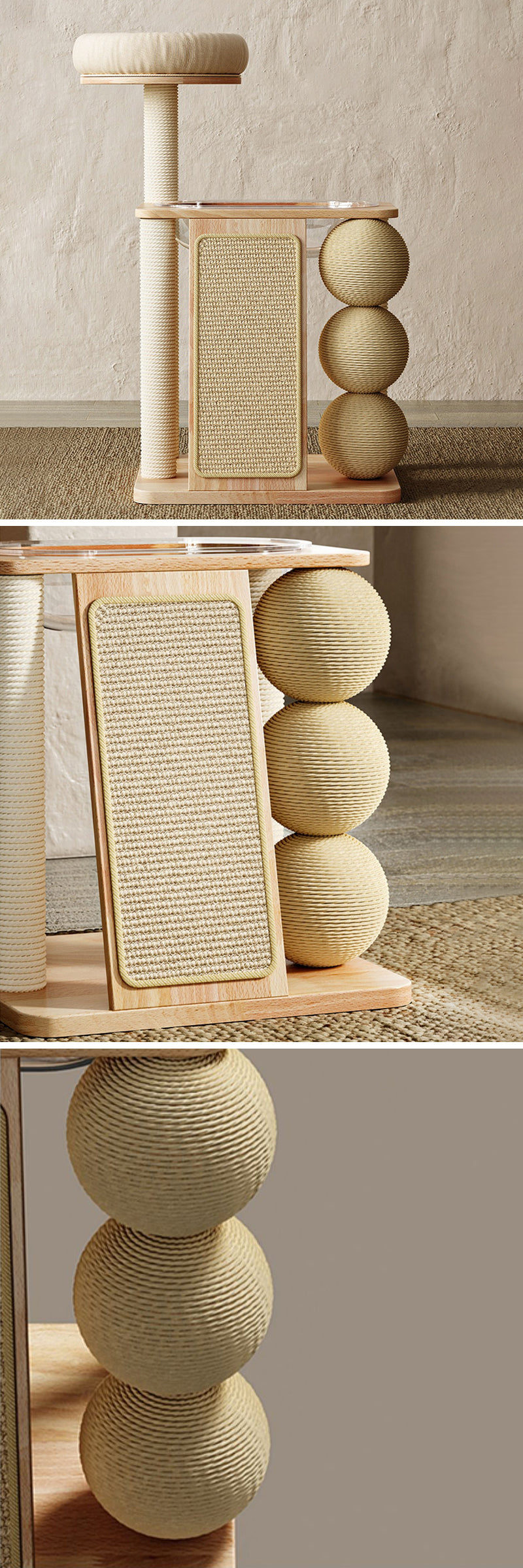 このキャットタワーは、球体デザインを随所に取り入れ、視覚的な美しさと猫の遊び心を刺激する構造になっています。