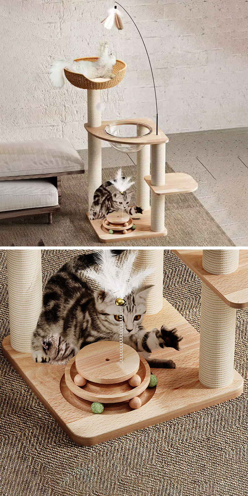 猫たちのためにデザインされたこのキャットタワーは、限られたスペースにぴったり収まるコンパクトサイズです。