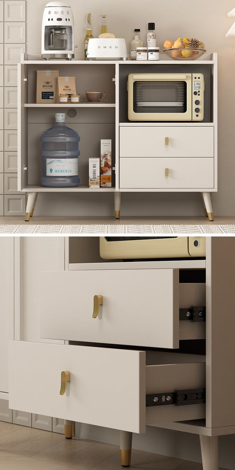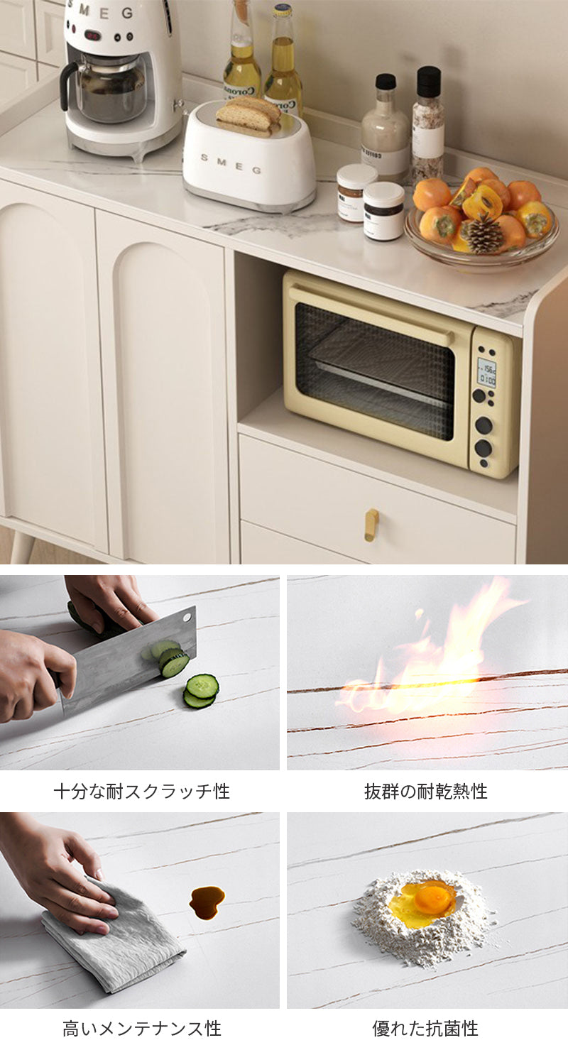 洗練された外観と、ゴールドの取っ手や脚部のアクセントが、キッチンやダイニングに上品な雰囲気を与えます。