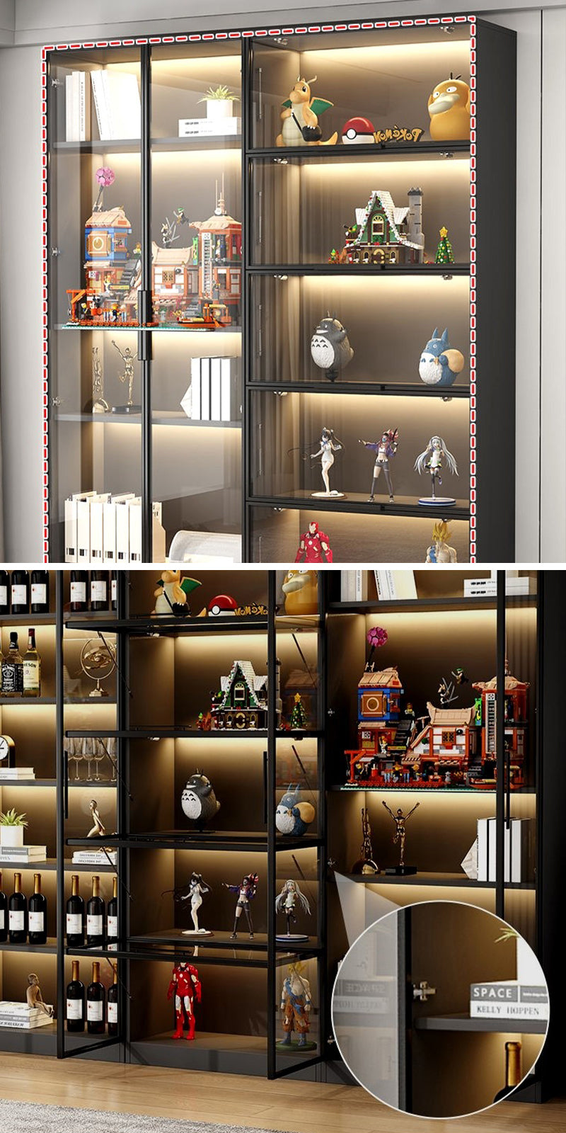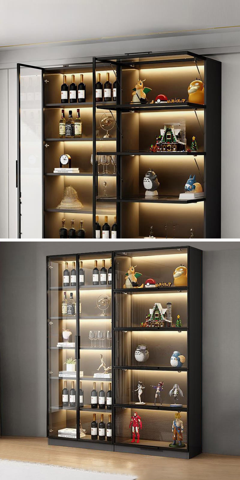 キャビネット内に内蔵されたLEDライティングが、収納アイテムを優しく照らし、目を引く美しいディスプレイを作り出します。