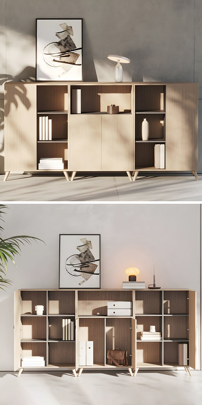 複数のオープンスペースと扉付きの収納スペースを備えており、実用性に優れています。