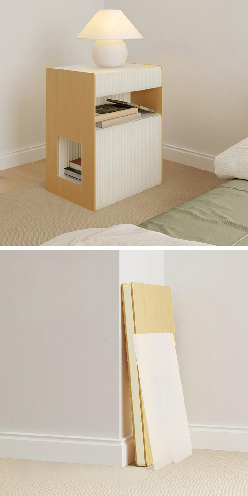 ナイトテーブルには高低2種類の仕様があり、サイド部分に斜めに開いた専用の本棚スペースがあります。