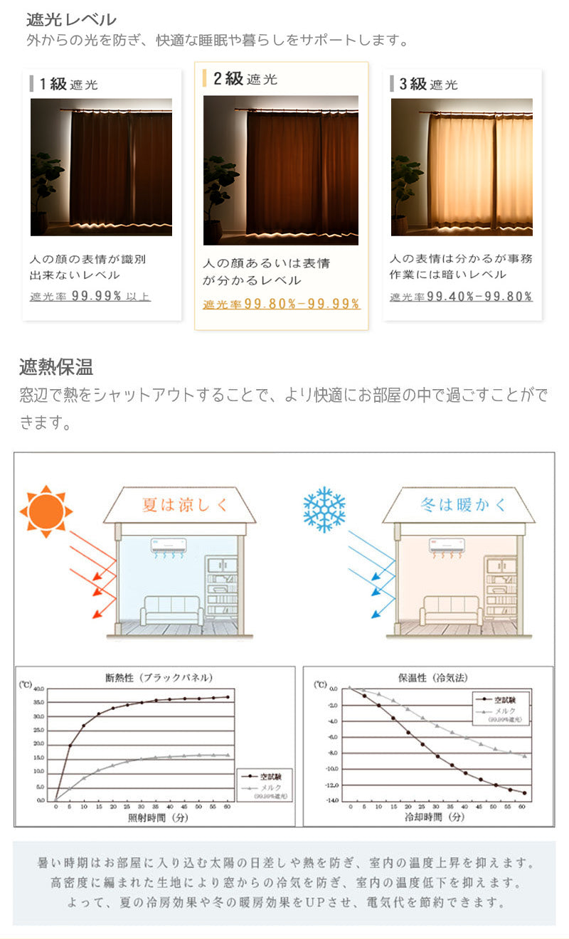 ・機能:遮光、遮熱、防音、防虫・防ダスト効果。形態安定加工、洗濯機又は手で丸洗い可能 ・遮光レベル:遮光2級 |