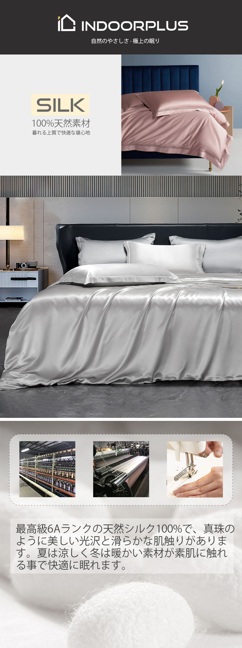 シルクは滑らかな肌触りを実現できる為、他の素材より滑り落ちやすいのが事実ですが、弊社のシルク製品の縁がずれ防止のデザインで丁寧に縫製され、ベッドから滑り落ちません。カバー内側にずれ防止の紐がついている為、布団が泳いでいる心配する必要がございません。