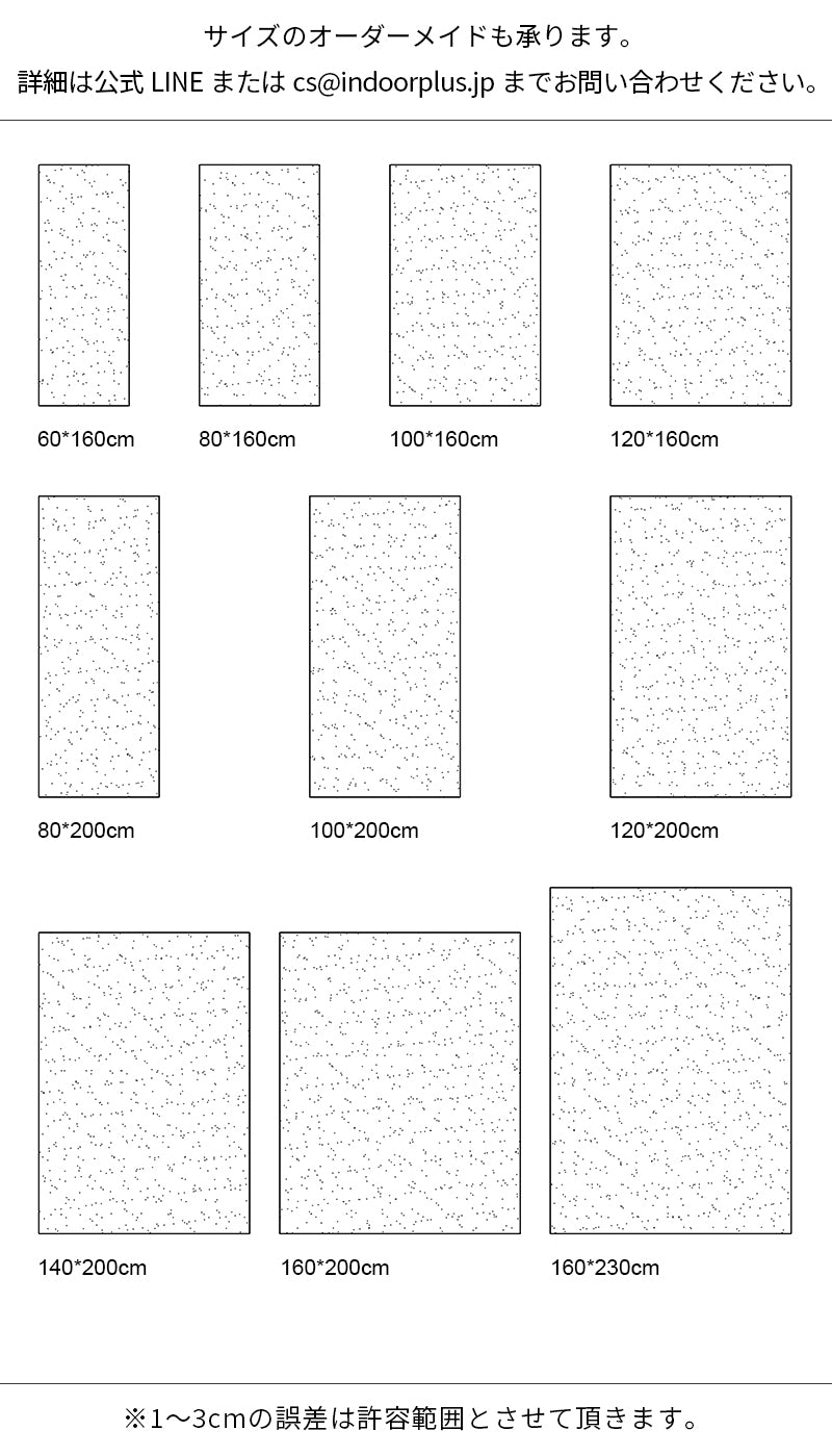 カーペットは織物構造の製品の為、若干サイズのずれが発生しますが、使用に影響が出ない程度に収まります。特に手織りのカーペットにつき、模様を美しくする為に、職人さんより微調整することもありますので、予めご了承ください。