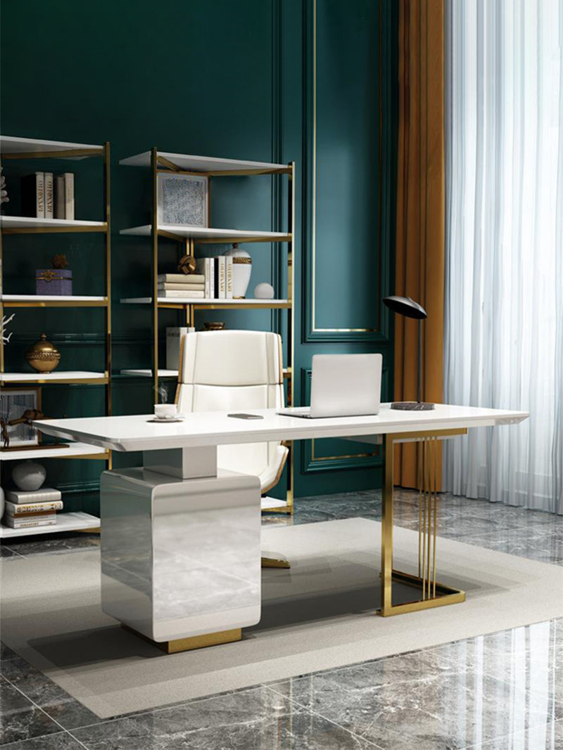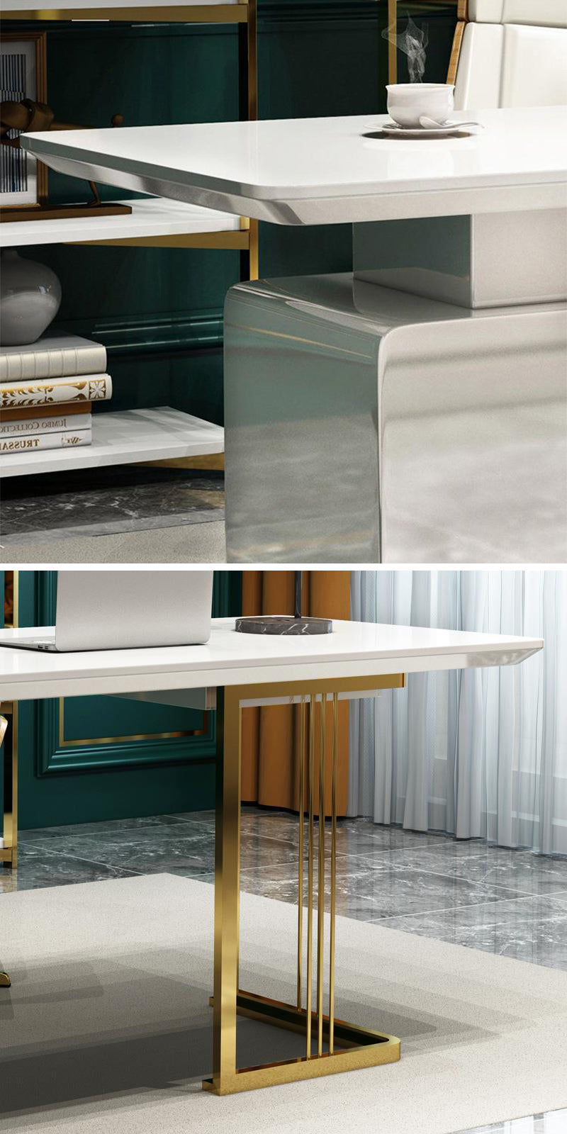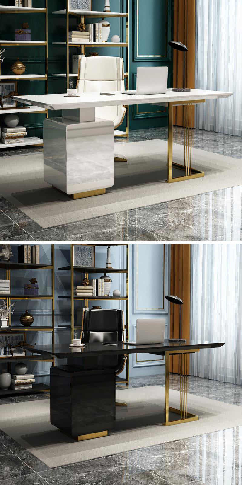 このデスクには、環境に優しいHDF高密度繊維板が使用されており、ピアノ塗装仕上げによる高級感とエコフレンドリーな特性が見事に調和しています。