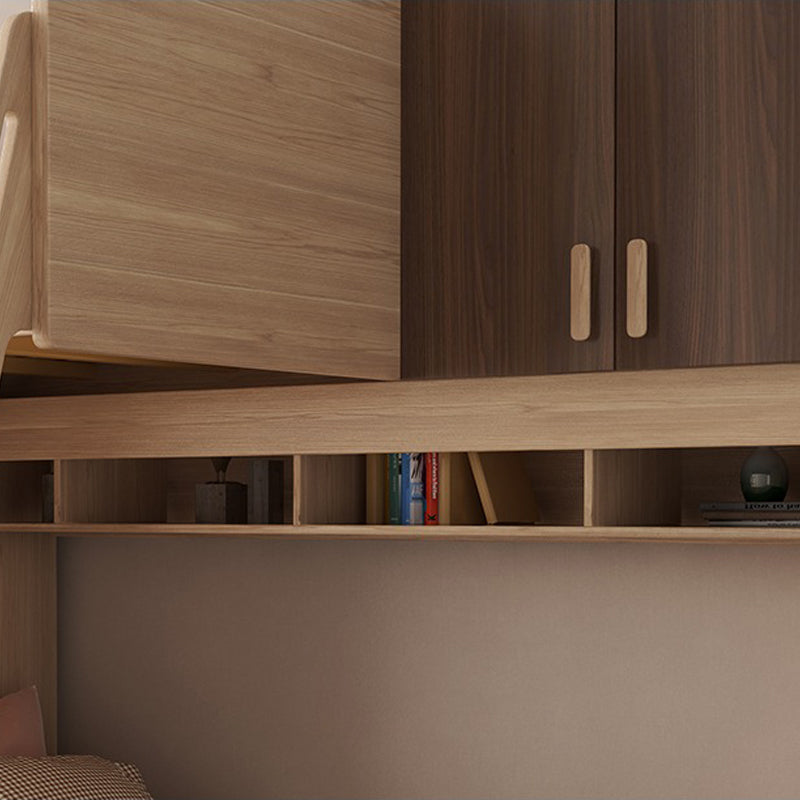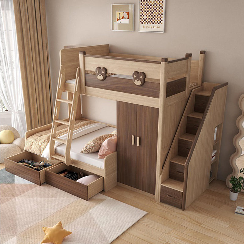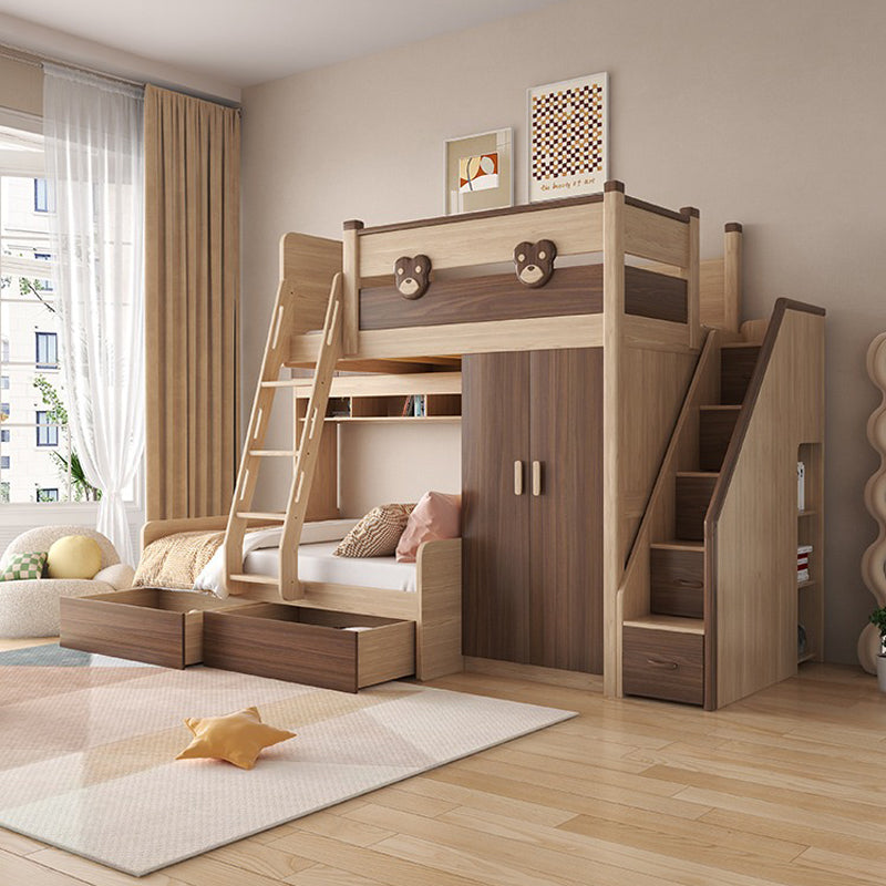 おしゃれで機能的なデザインが特徴的な収納付きナチュラル二段ベッドです。ベッド全体にナチュラルな色合いの木材を使用し、落ち着いた雰囲気を醸し出しています。