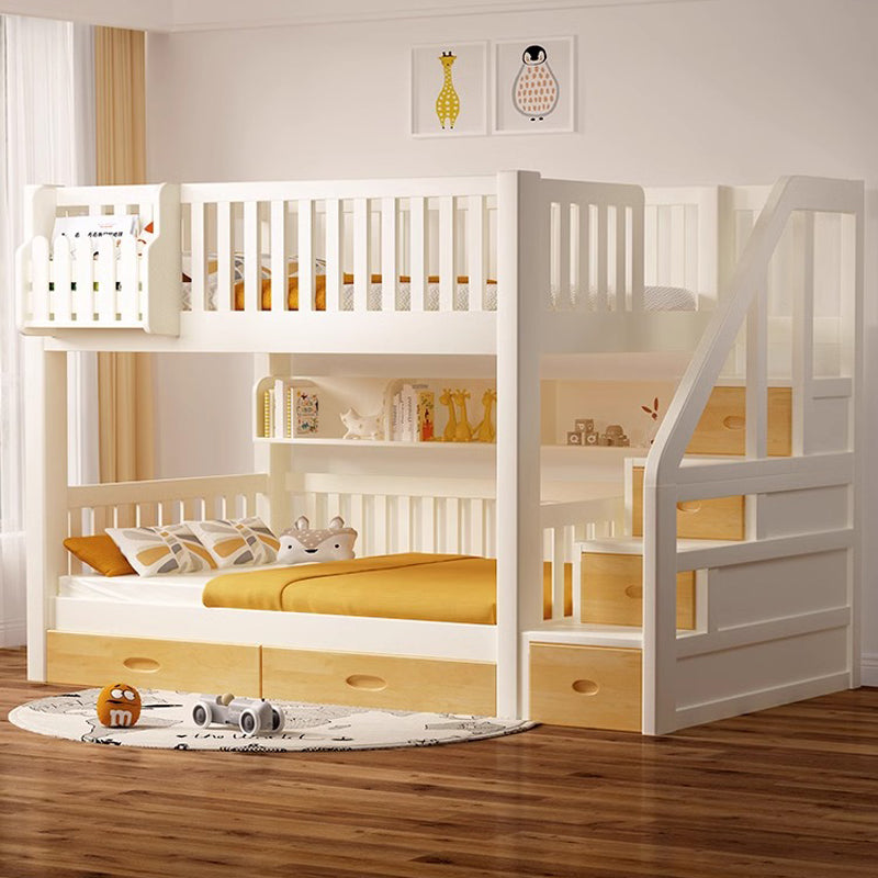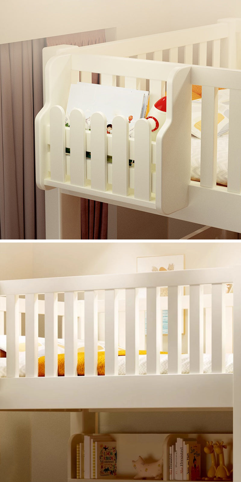 ナチュラルな色合いとホワイトの組み合わせが、どんなインテリアにもマッチする収納付き二段ベッドです。