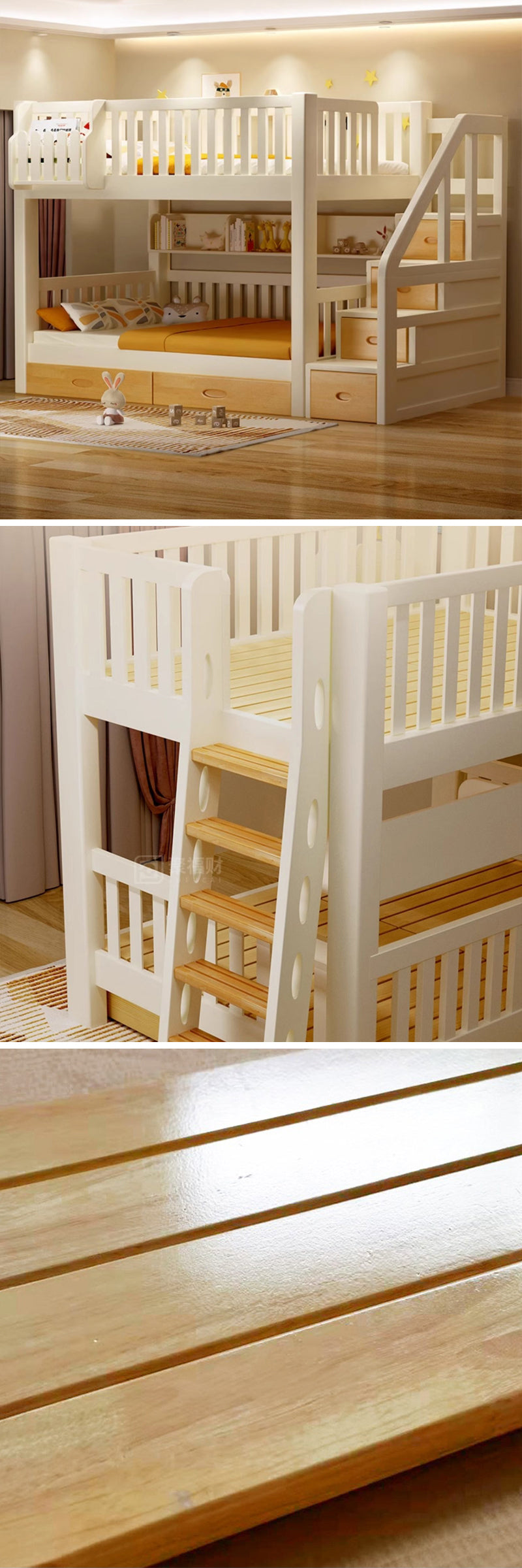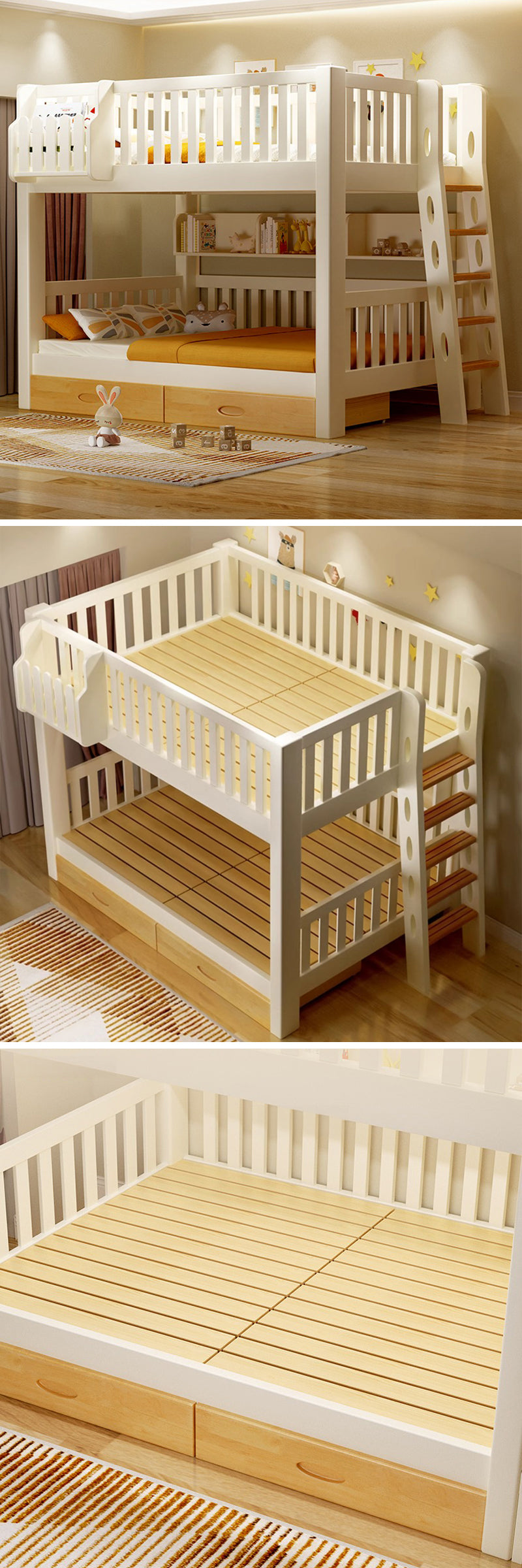 この二段ベッドは、部屋に温かみを与えるデザインが特徴です。ナチュラルな木の風合いとホワイトのアクセントが、リラックスできる空間を作り出します。