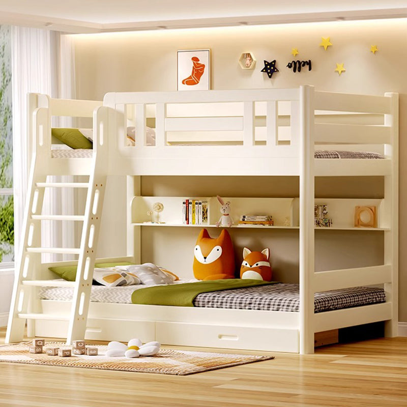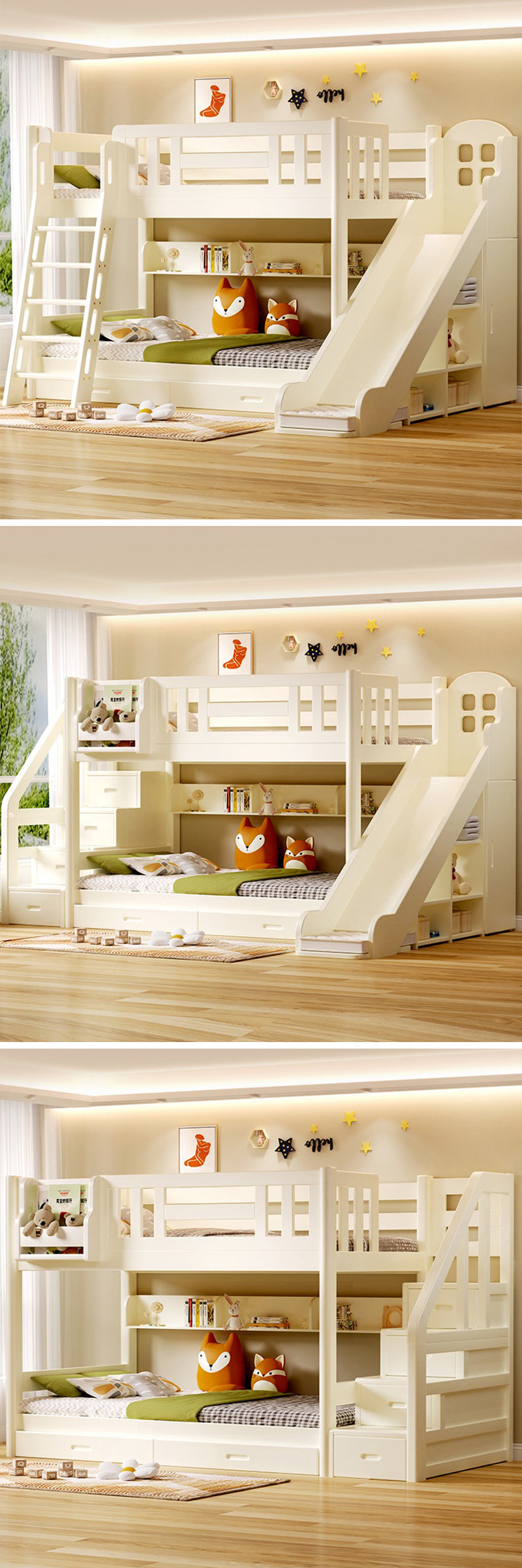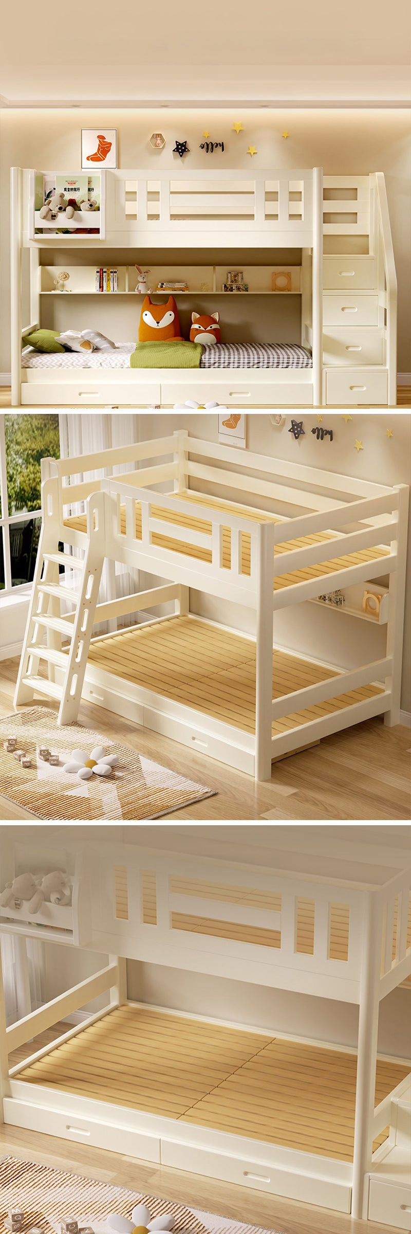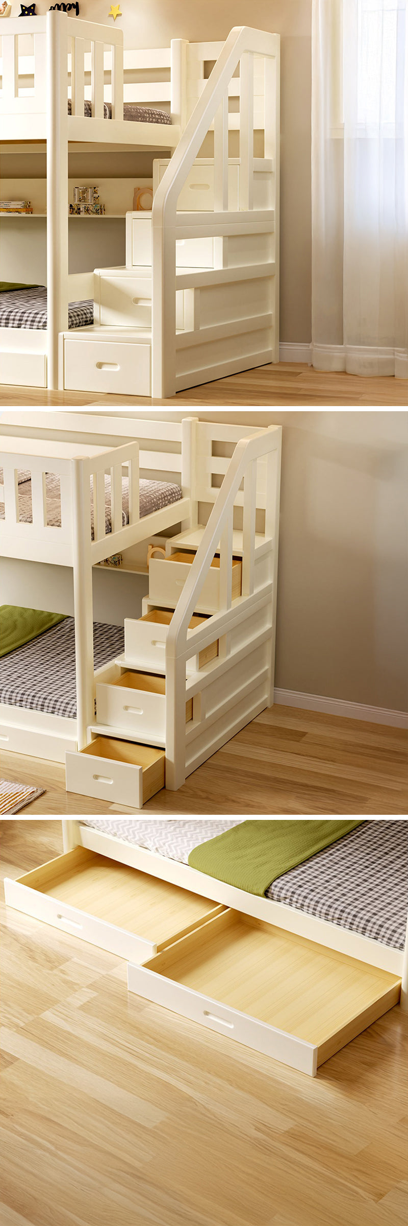 階段付きのデザインは、上段へのアクセスが容易で、小さなお子様でも安全に使用できます。収納スペースも豊富にあり、引き出しには衣類や玩具を整理整頓できます。