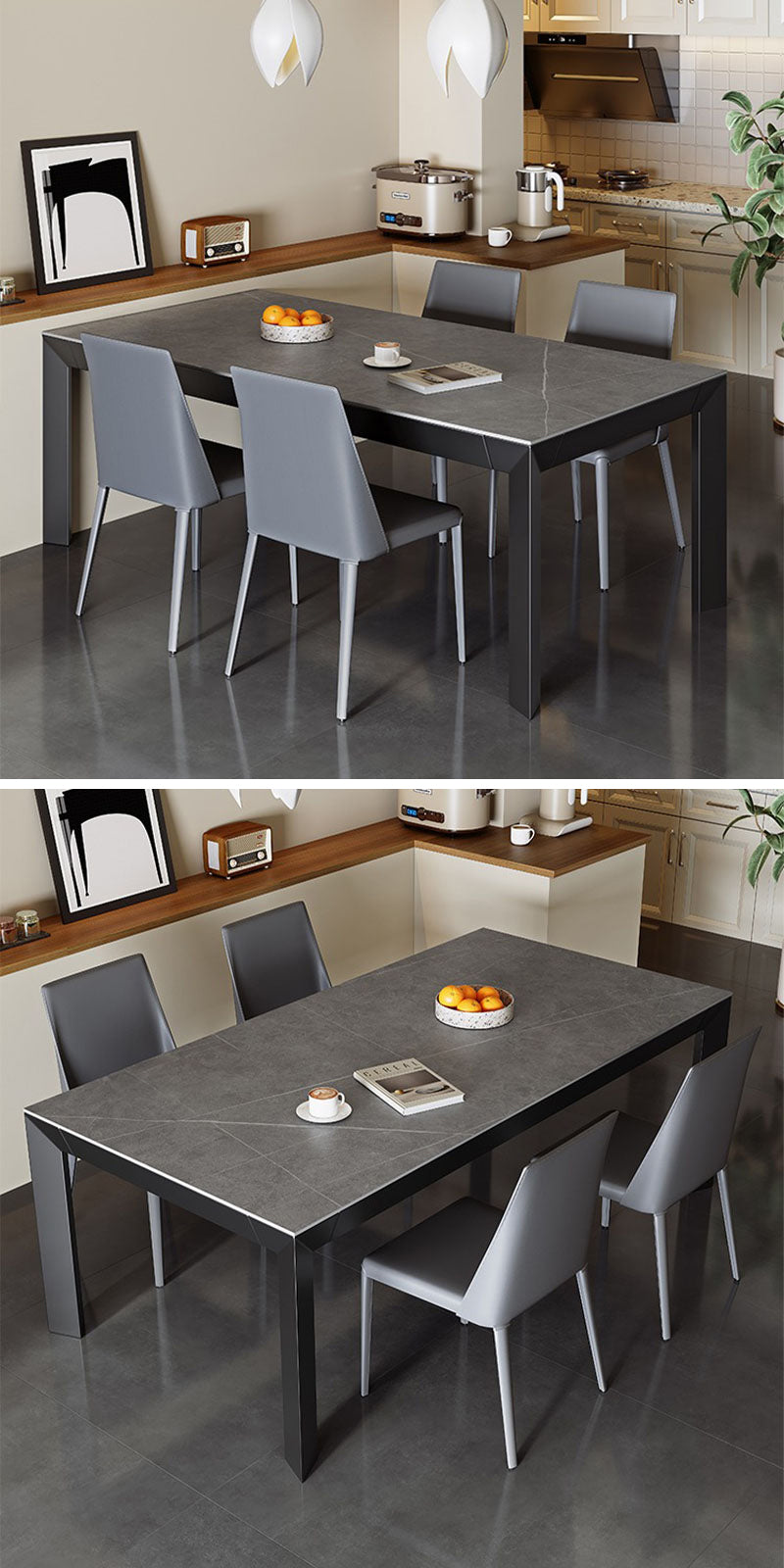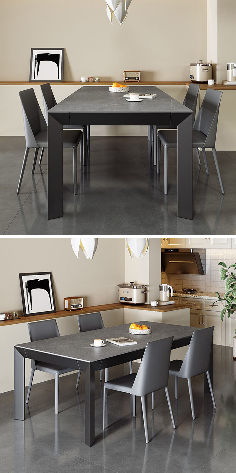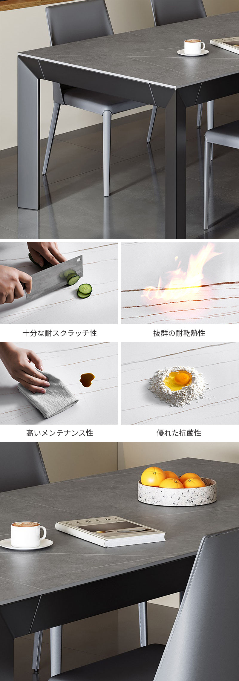 このダイニングテーブルは、そのモダンで洗練されたデザインが際立っています。高級シントレードストーン(セラミックの一種)を使用した天板は、耐久性に優れ、美しいグレーの色合いが特徴です。
