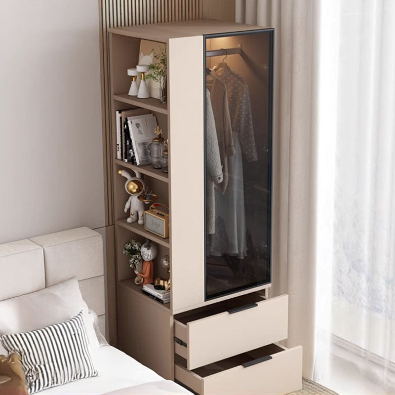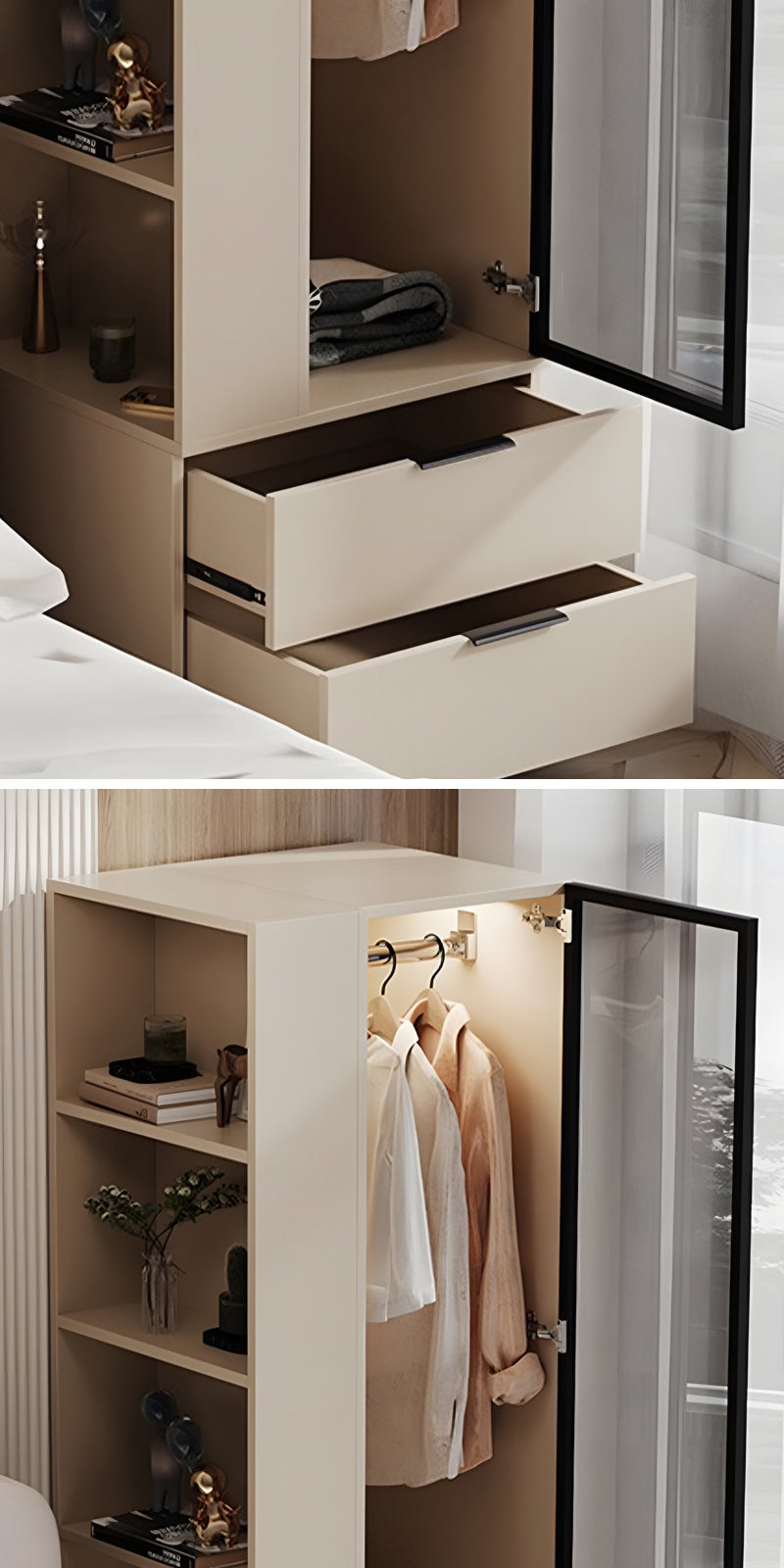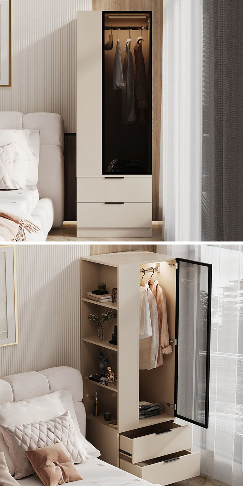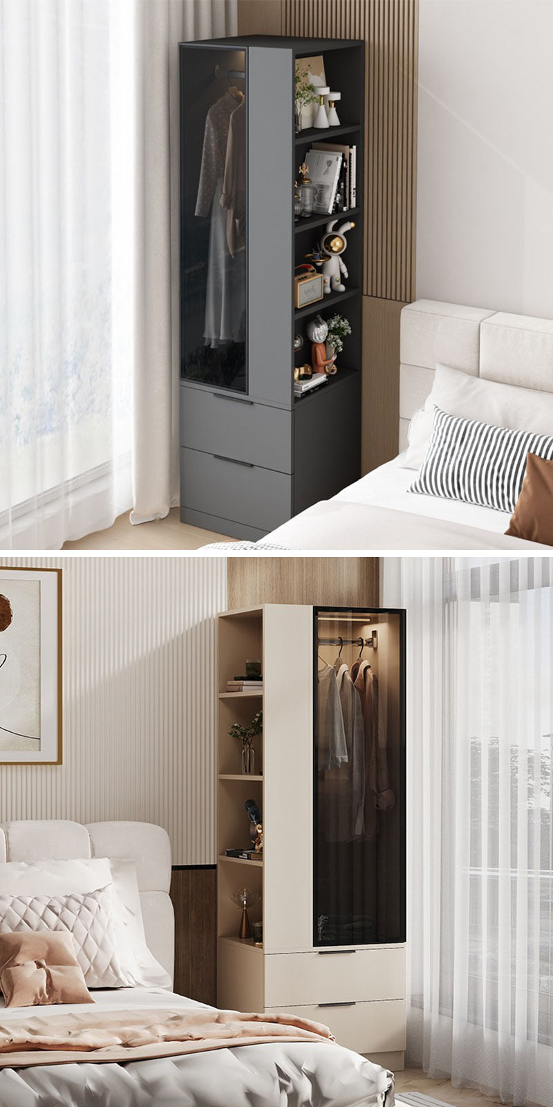 洋服を収納できるたんすと引き出し、側面にはオープン型の収納スペースを備えています。