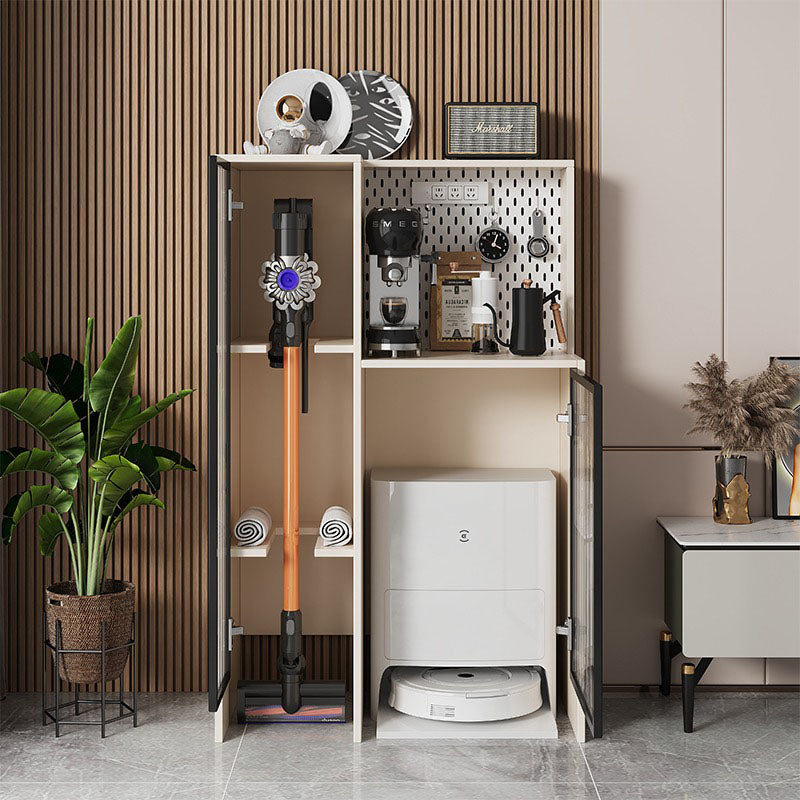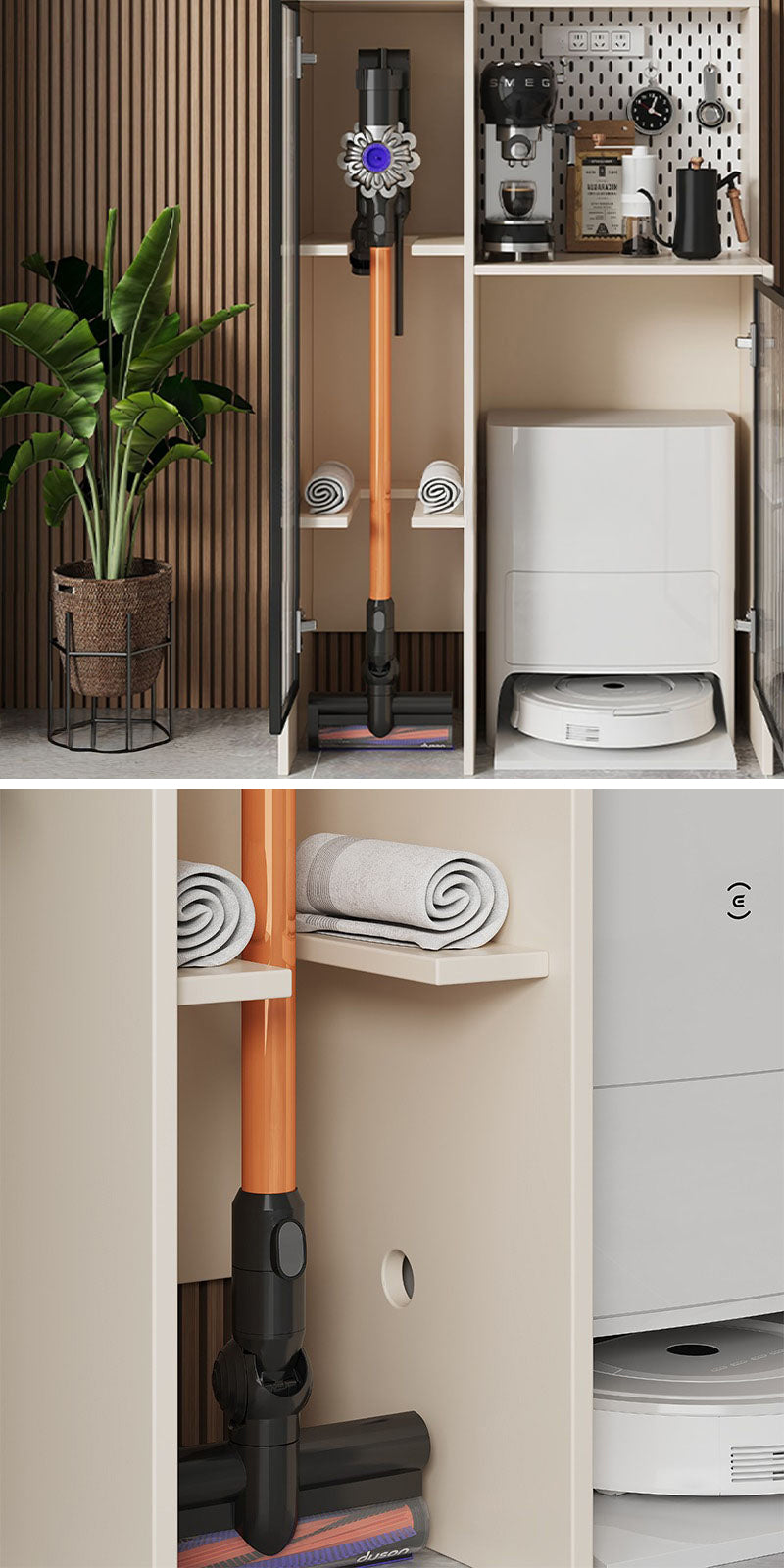 棚内には、掃除機専用の収納スペースや掃除ロボット用のエリアが用意され、日常的な清掃用具を効率的に整理できます。