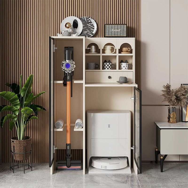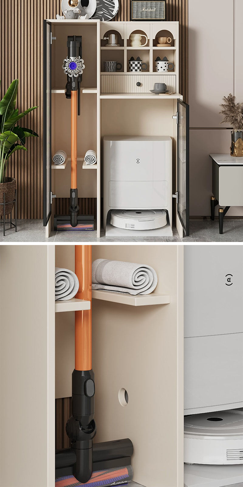 掃除機の収納スペースや掃除ロボットの収納エリアが備えられており、清掃用具をすっきり整理できます。