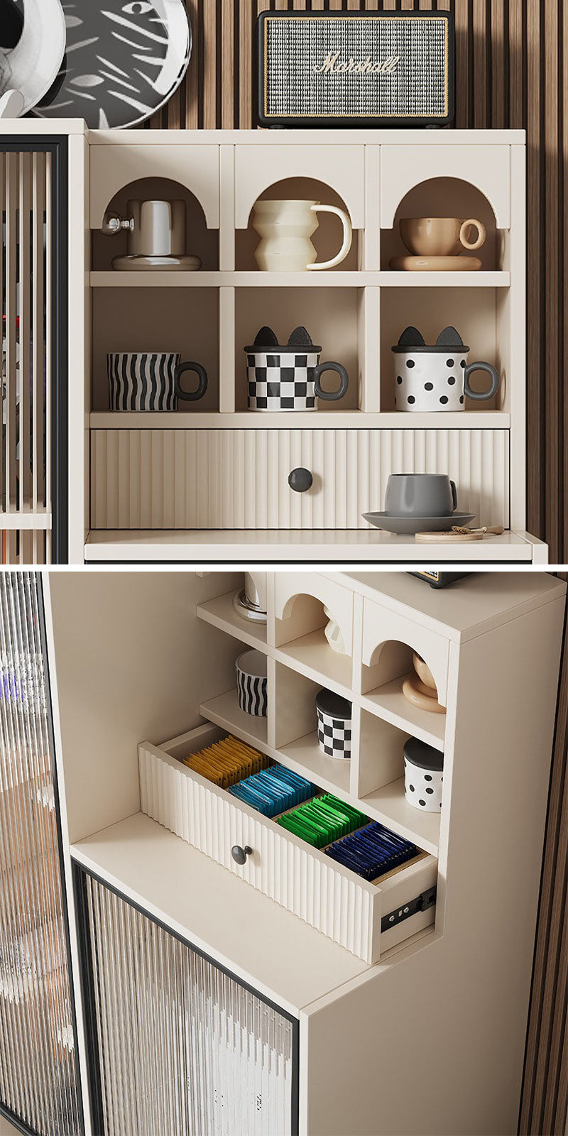 上部にはカップラックが設けられており、コーヒーカップやティーカップを収納するだけでなく、ディスプレイとしても楽しむことができます。