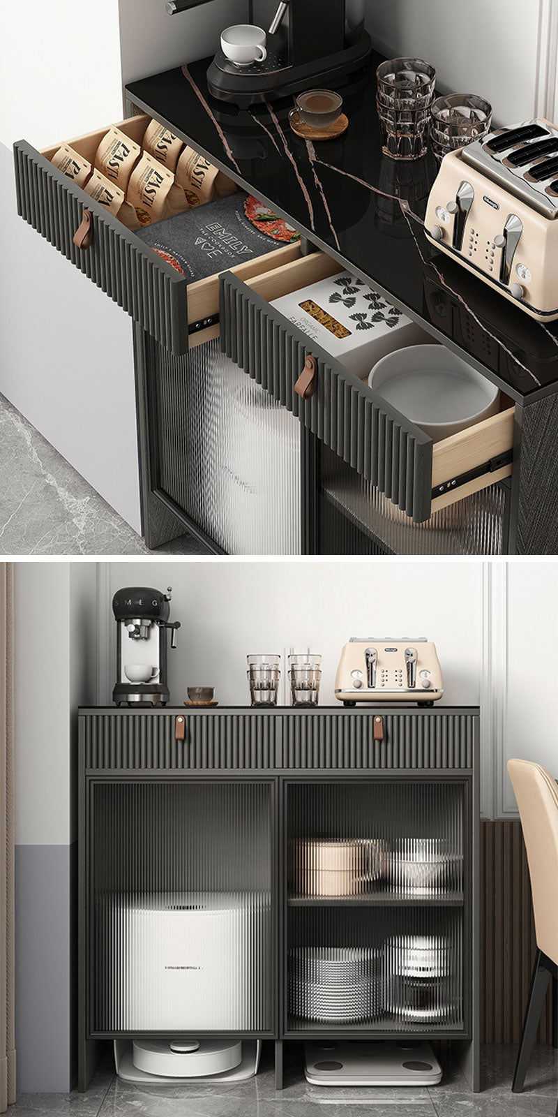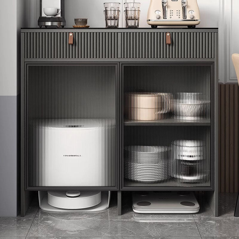 ミニマルなデザインと落ち着いたカラーリングが特徴で、縦線状のテクスチャと、透明感のある波模様ガラスの扉が洗練された印象を与えます。