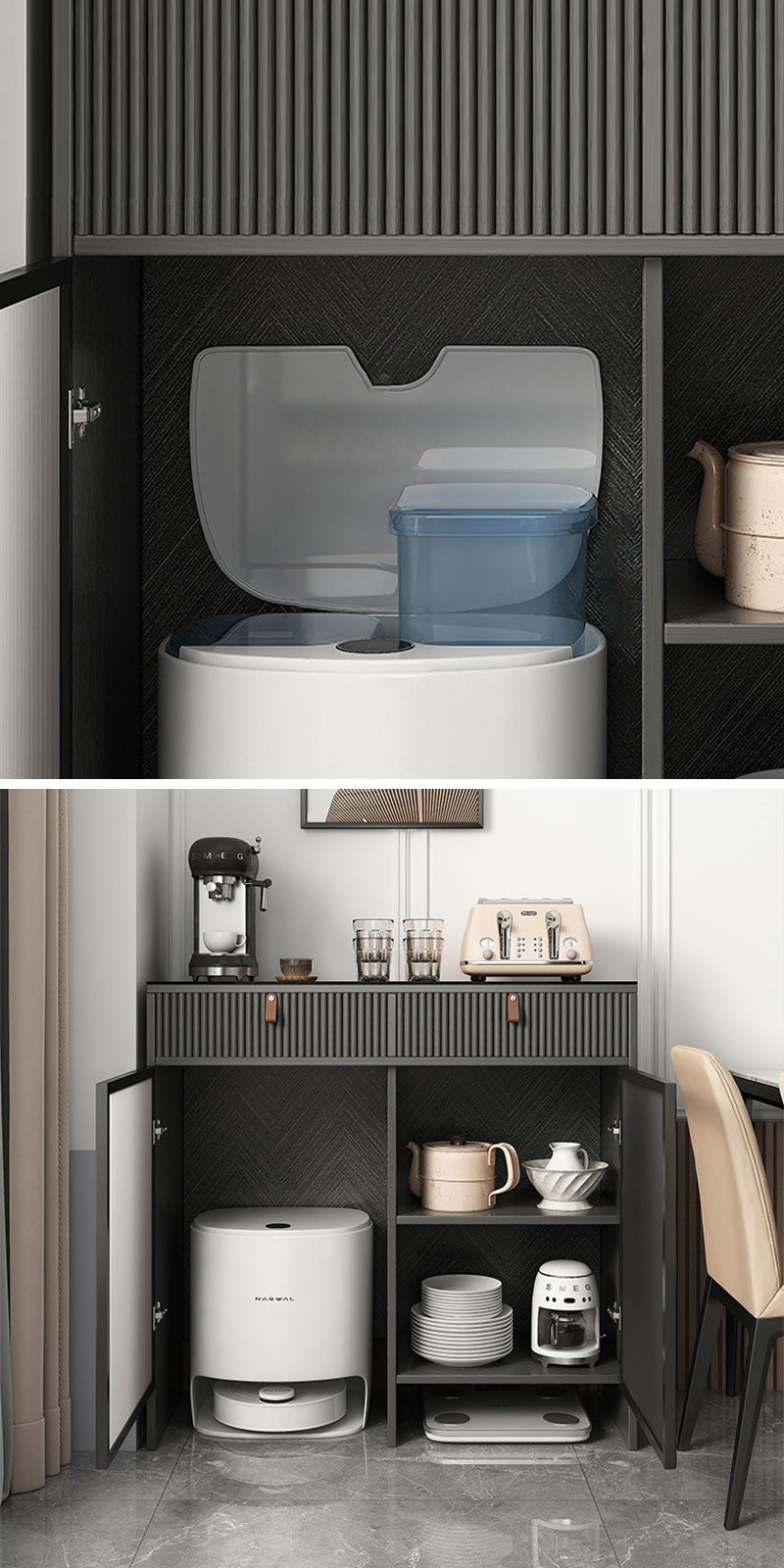 掃除ロボット専用の収納スペースや食器類の収納棚が設けられており、日常生活のさまざまな収納ニーズに対応します。