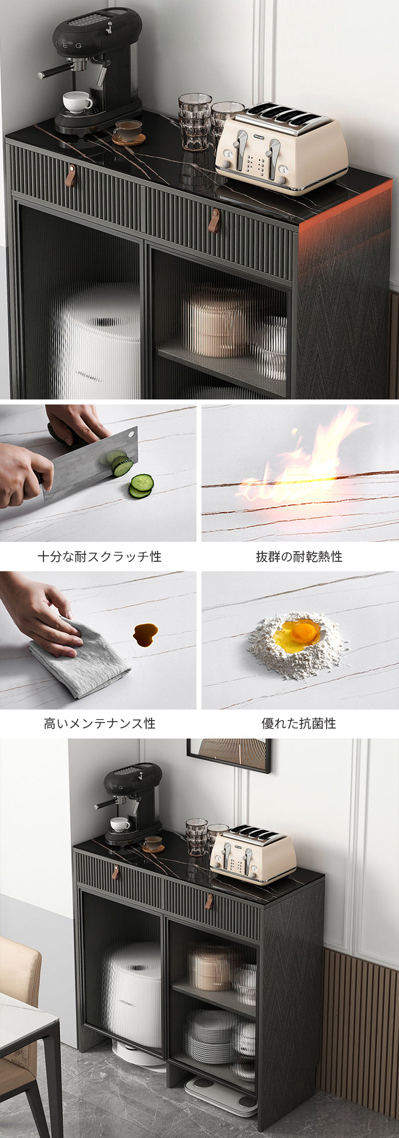 ■新型コロナウイルス感染症の感染拡大を受け、超大型便の運輸及び倉庫保管のコストに関わる経費と輸送コストの増大に伴って、食器棚は 【安心の100日間返品交換保証】適用対象から除外しました。