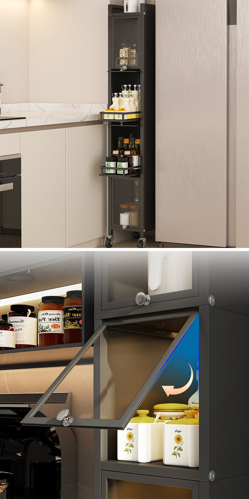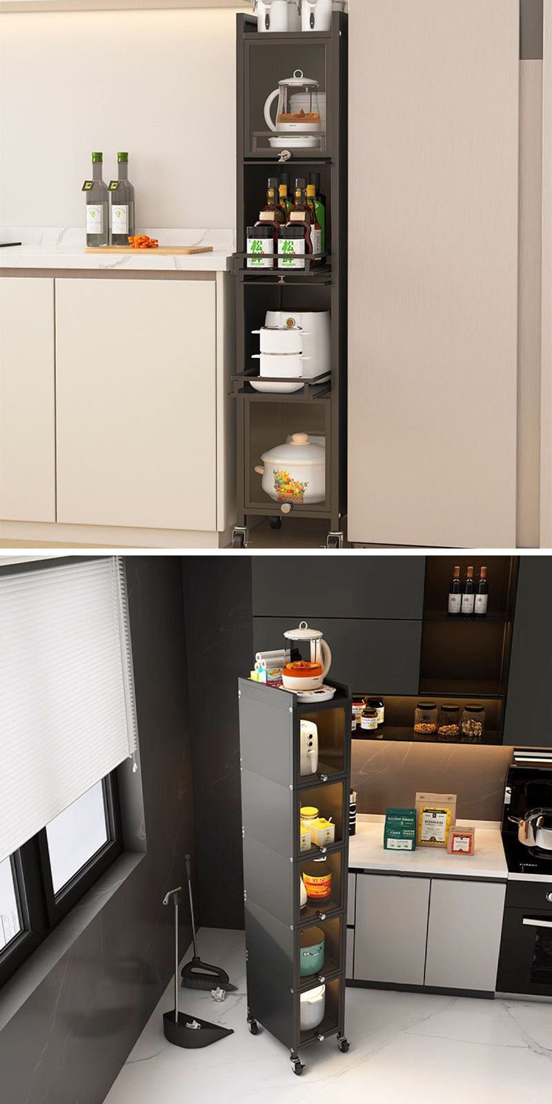 スリムで隙間に収まる設計が、キッチンや冷蔵庫横など、デッドスペースになりがちな場所を有効活用します。