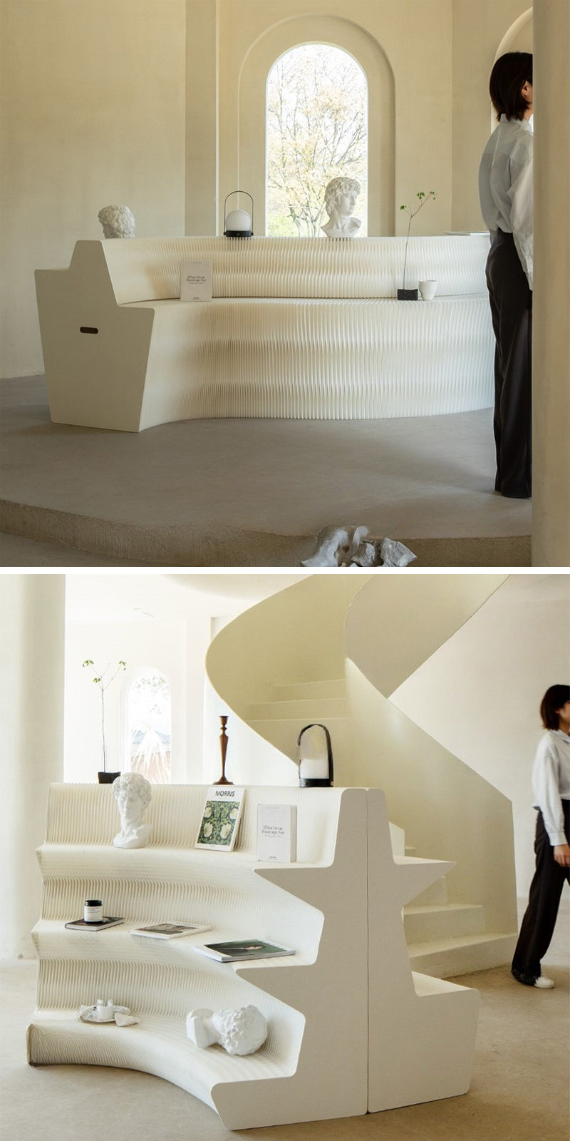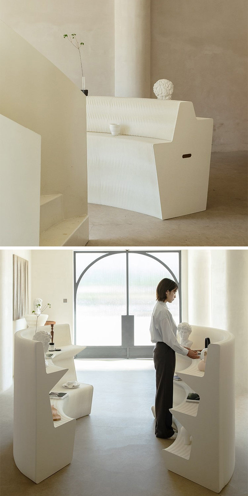 洗練された立体的なフォルムを持つカウンターテーブルは、シンプルでありながらも空間に独特のアクセントを加えます。