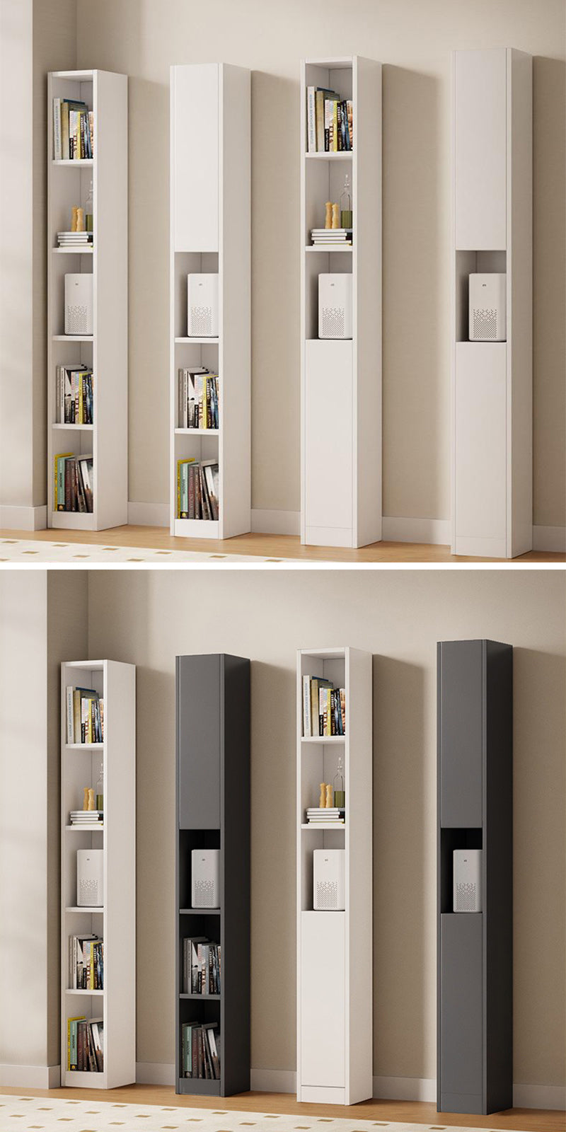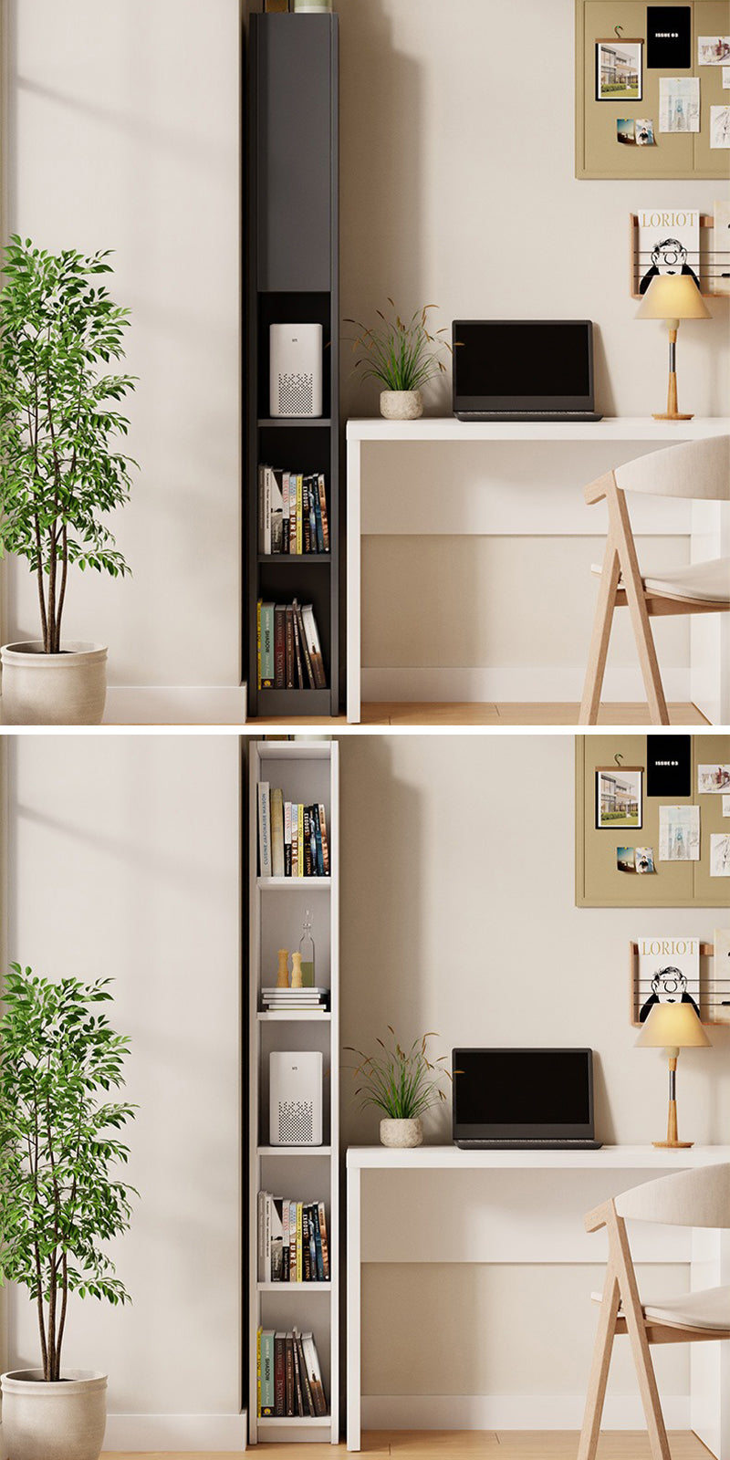 幅20cmのスリムな形状にも関わらず、棚を効率よく配置しているため、書籍や小物を整然と収納できます。